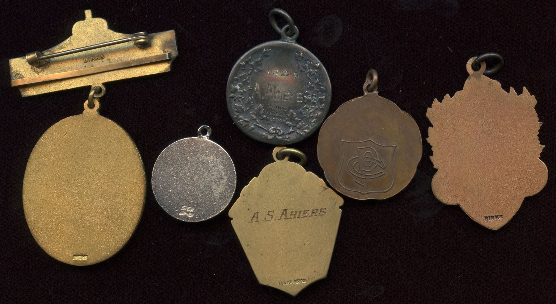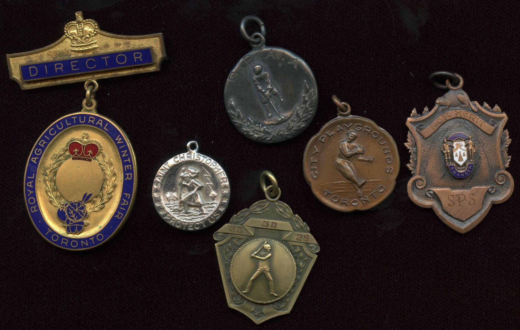 Silver golf and gold filled baseball medals presented to A.S. Ahiers, a nice Director's badge for the Royal Agricultural Winter Fair, Toronto, 3 small medals. We recommend viewing. Lot of 6 Pcs.