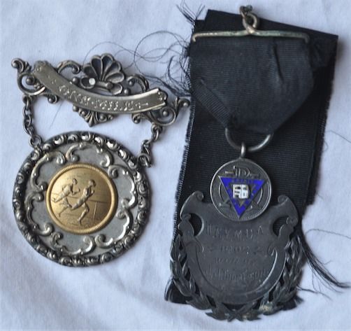 Canadian National Exhibition mile, unnamed, silver with gold insert, bar with 2 chains at top of medal; W.E.Y.M.C.A. (West end?) 1902, named to J.J. Thompson, AR, loop at top with black ribbon, 33gms. 2 Pcs.