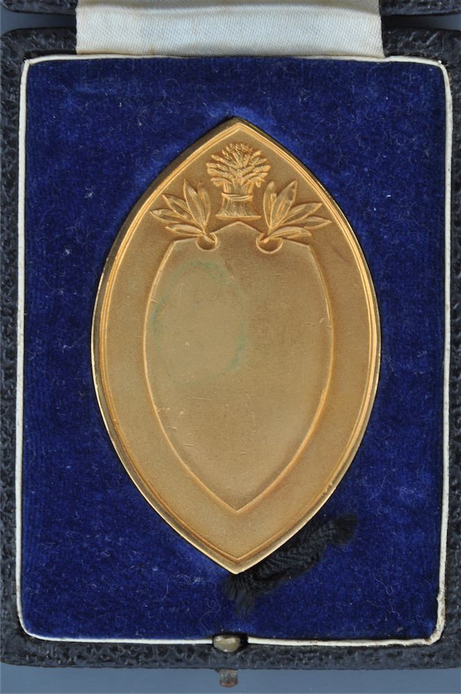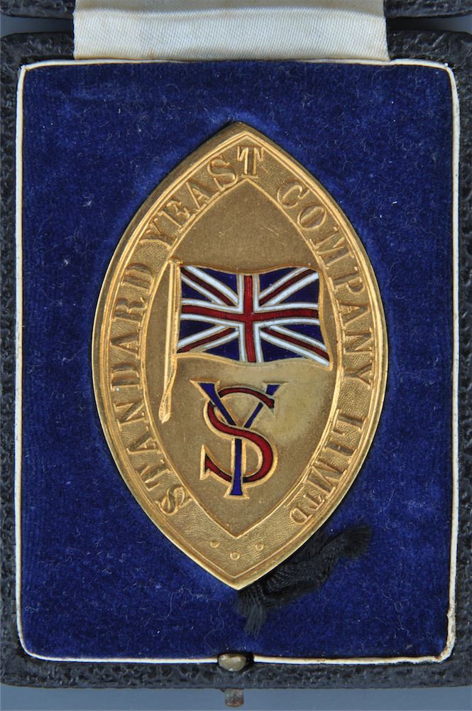 Great Britain, copper gilt and partially enameled in red, blue and white. Obv. Standard Yeast Company Limtd with Union Jack and crest in center; Rev. sheaf of wheat at top with large space for engraving purposes, 14.1 gms, in case of issue, unnamed.