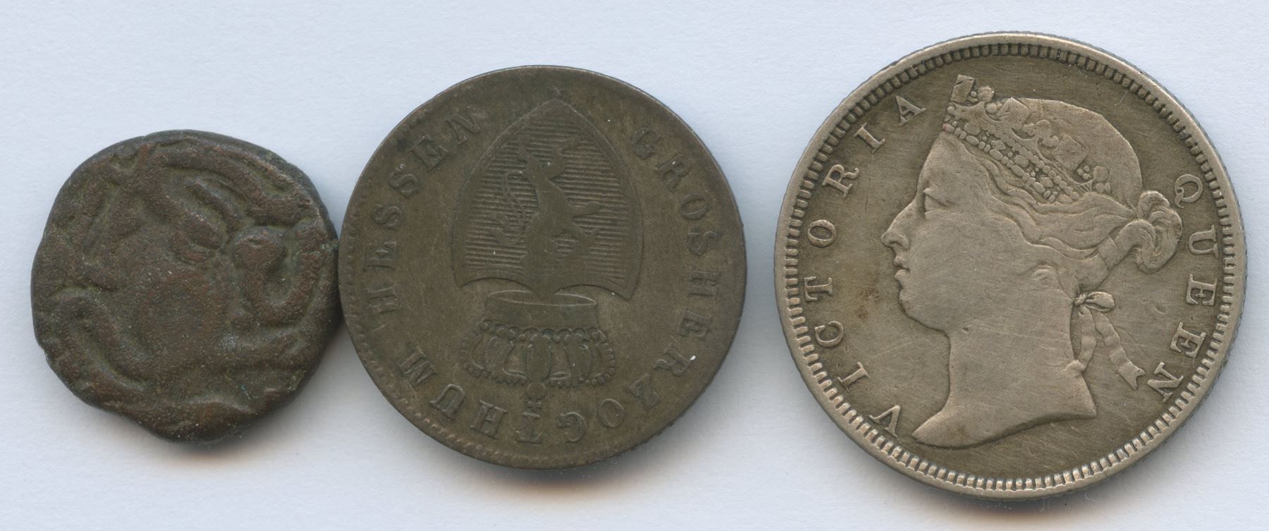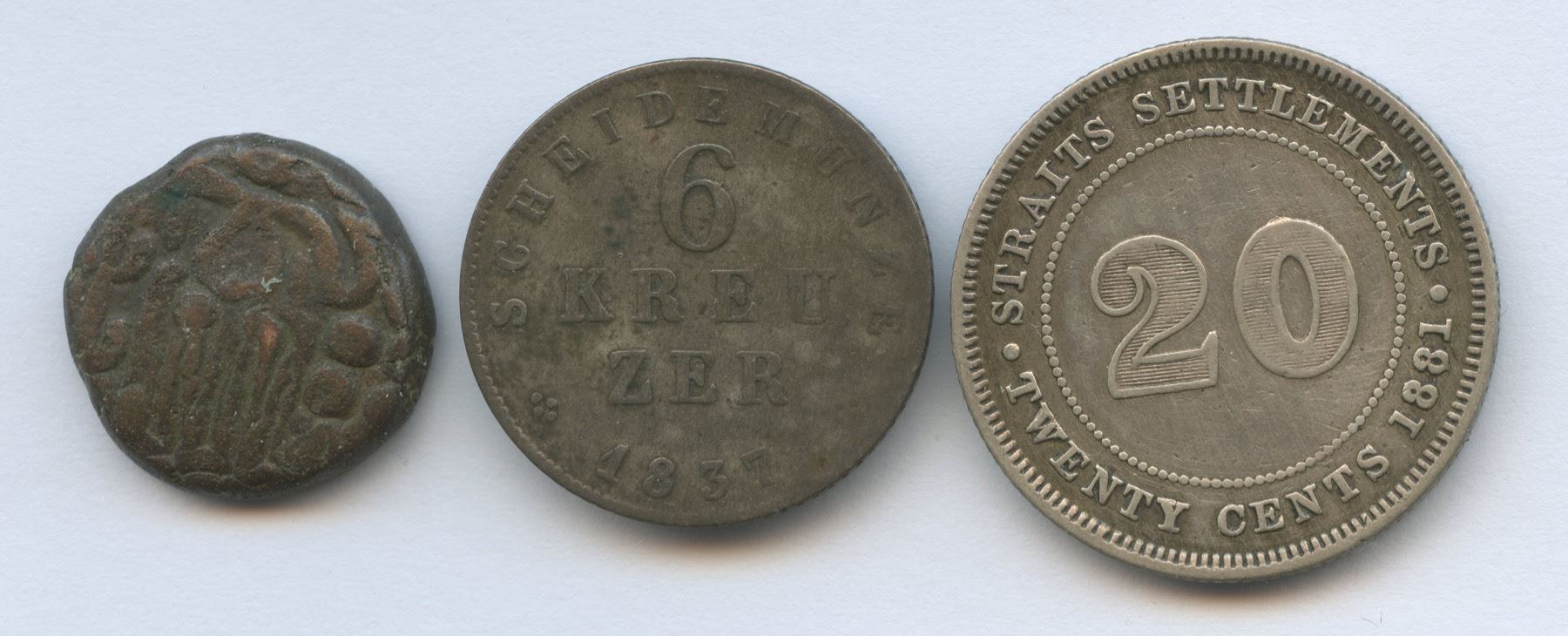Includes: 1881 Straits Settlements twenty cents, fine. 1837 German States, Hesse-Darmstadt 6 Kreuzer, VF. India Raja Raja copper stater. 3 Pcs.