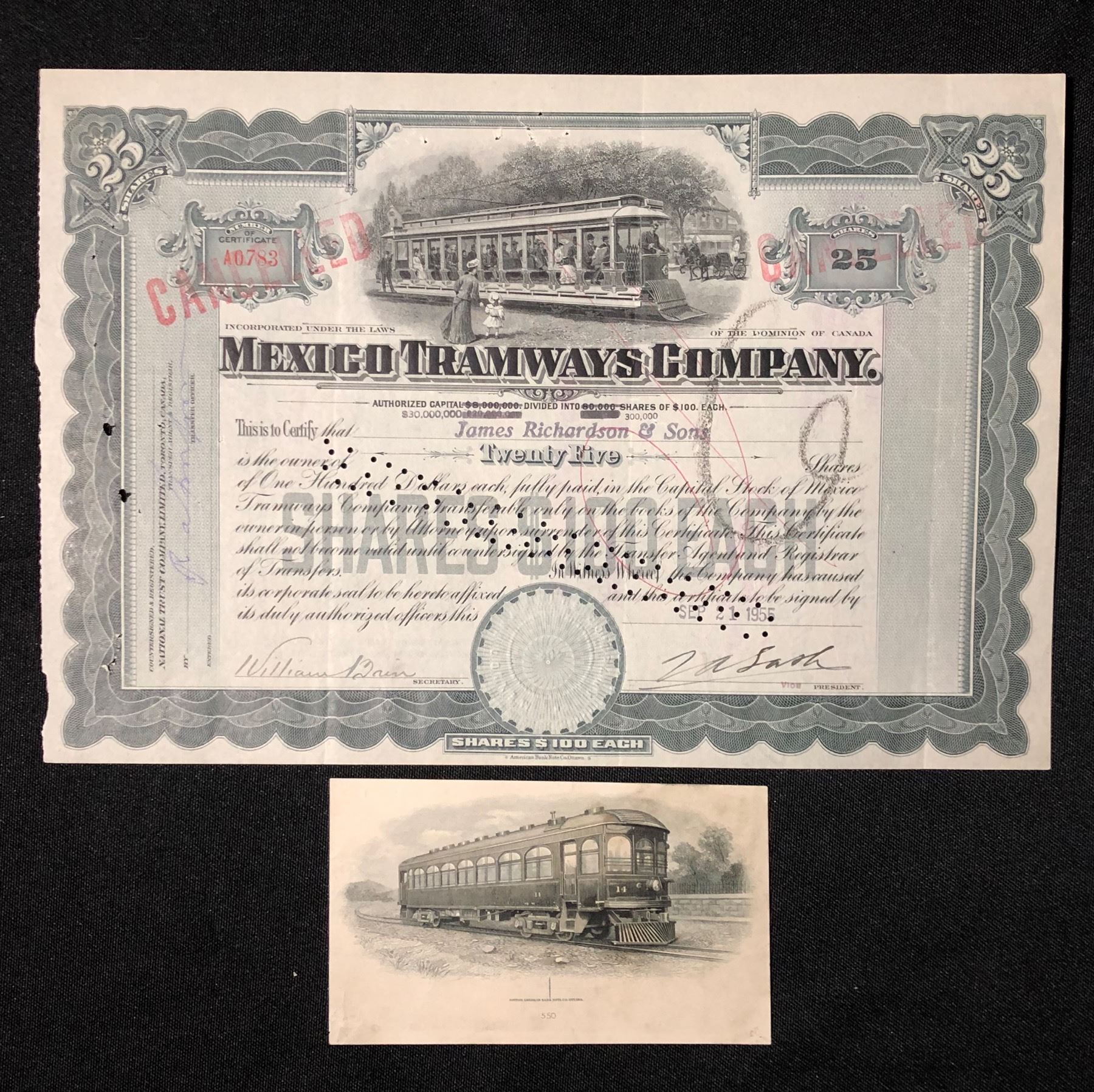 Streetcar Scenes. Vignette, BABN #550, showing a streetcar. Also Mexico Tramways Co., Certificate for 25 shares, issued 1955, with a fine streetcar vignette of an earlier era, ABN Co. Ottawa imprint, cancellation stamps and other markings. The issuing company was incorporated in Canada and represented a significant Canadian investment in Mexico in the early 1900s.