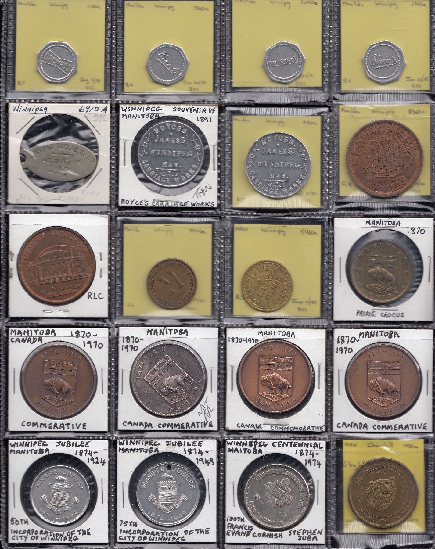 Advertising: Drewrys 5100a; Kiewel’s 5580a; Pelissier’s 6240c; Shea’s 6540a; Winnipeg Taxi Cab Co., Stewart 6910a, advertising key tag or possibly early charge id, as it has stamped #229; Boyce’s Carriages 8320a, 2 specimens, one thin planchet, other thick. McColl 22, LeRoux 994g & CH EMBS-21; Winnipeg Auditorium / Dingwall 8360c (2); Kobold 8440a; G.F. Landon 8460a, McColl 219; Commemorative - common: Manitoba 1870-1970. Bison/Flower (5); Winnipeg 1874-1924 (3); Trade dollars: Churchill 1055a (R7); 6 others incl. Brandon, Thompson & Winnipeg; Sundry; 6 other tokens from consigner not related to Manitoba, and mavericks. VF - Unc. 32 Pcs.