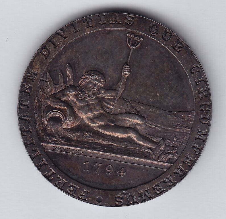 Uncirculated proof. 12.16 grams. Attractive iridescent toning, with some hairlining. While there is little doubt that the "restrikes" of Br 721 were marketed by J. Rochelle Thomas in 1894 to feed collector demand, the origins of the dies remains a topic of some dispute, as the "restike" dies are qute distinct from those of the 1794 originals. Articles by David Vice (Spink Numismatic Circular, March-June 1977) and J.E. Everingham (Warren Baker List No. 28 and 29, 1977) argue that the dies are poor late-Victorian imitations of the originals, falsely passed off by Thomas at the time as being a century old. John Ford elsewhere argued, on decidely speculative and circumstantial grounds, that they originate from a rejected set of dies contemporary to the 1794 originals, which were renewed for the restrikes (see New Netherlands Sale 60, notes to lot 56). Whatever the origin, the "restrikes" are scarce in silver, with Thomas claming to have struck a mere 12 in that metal.
