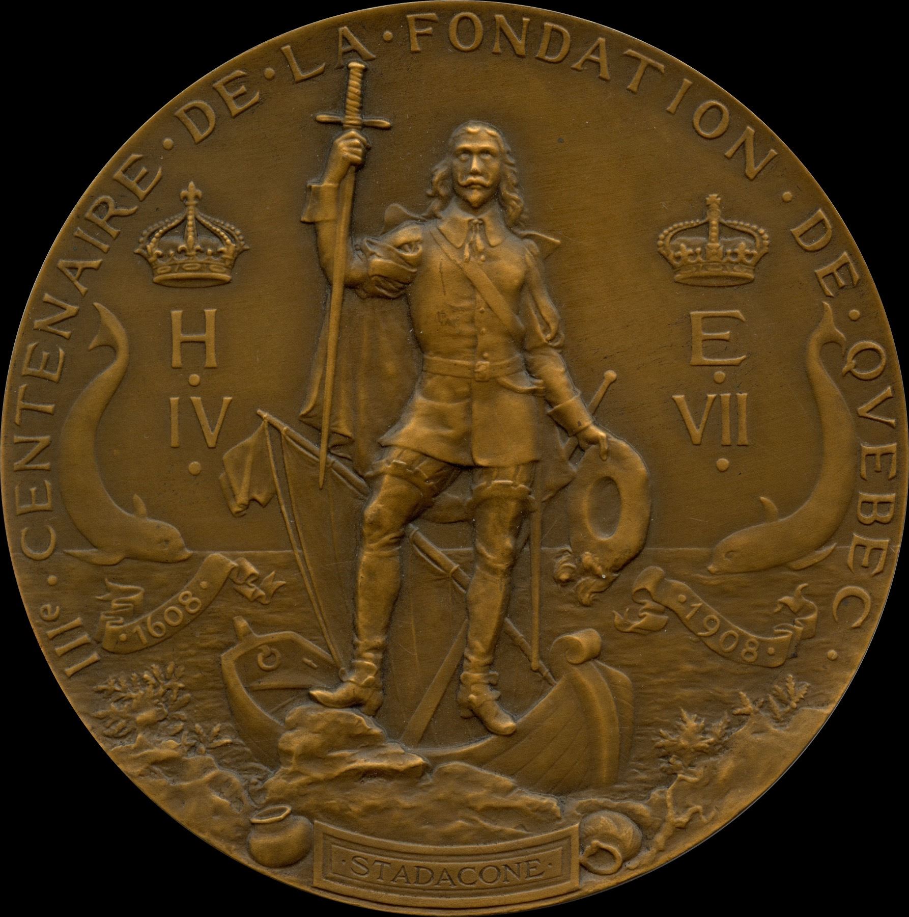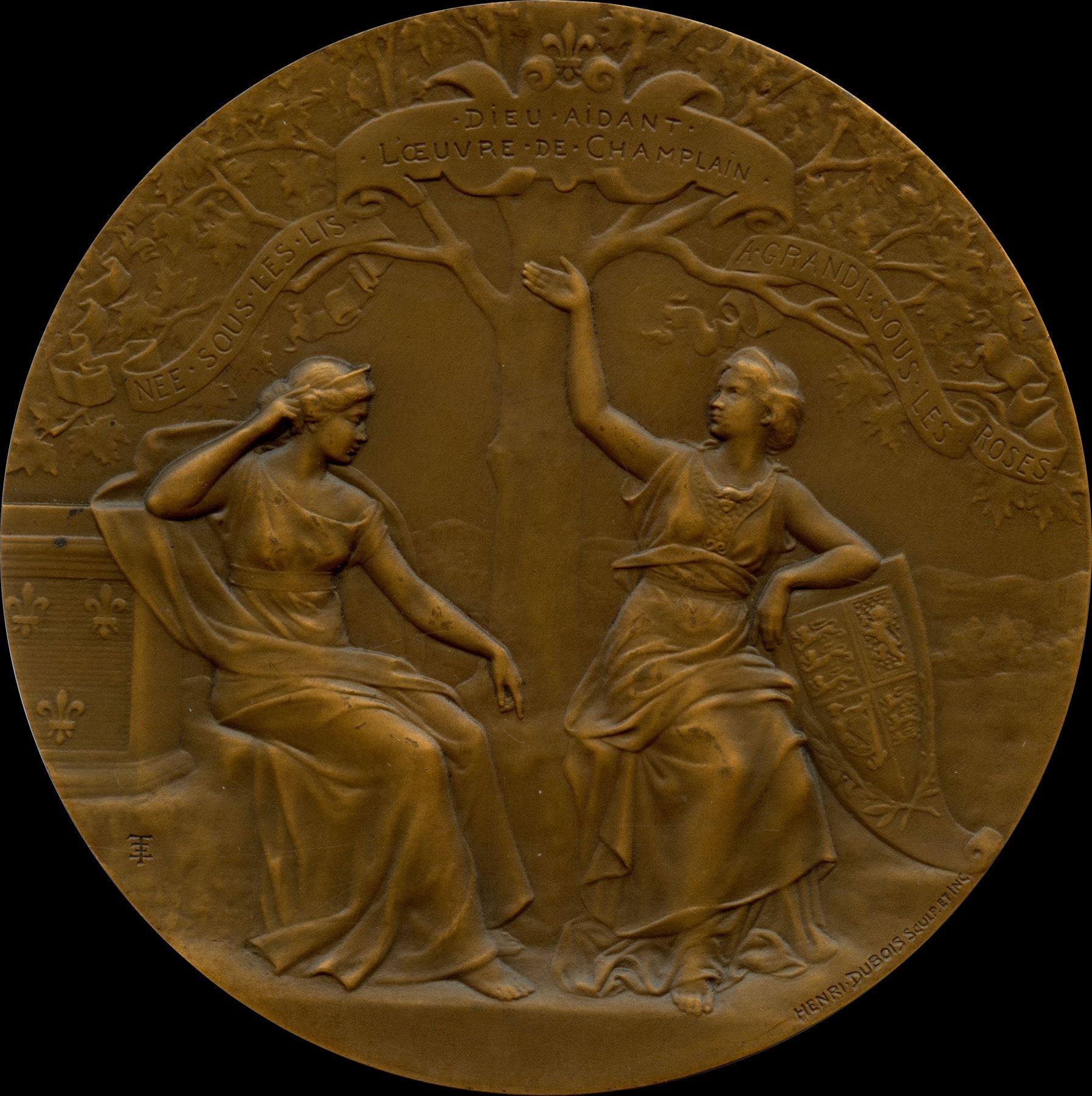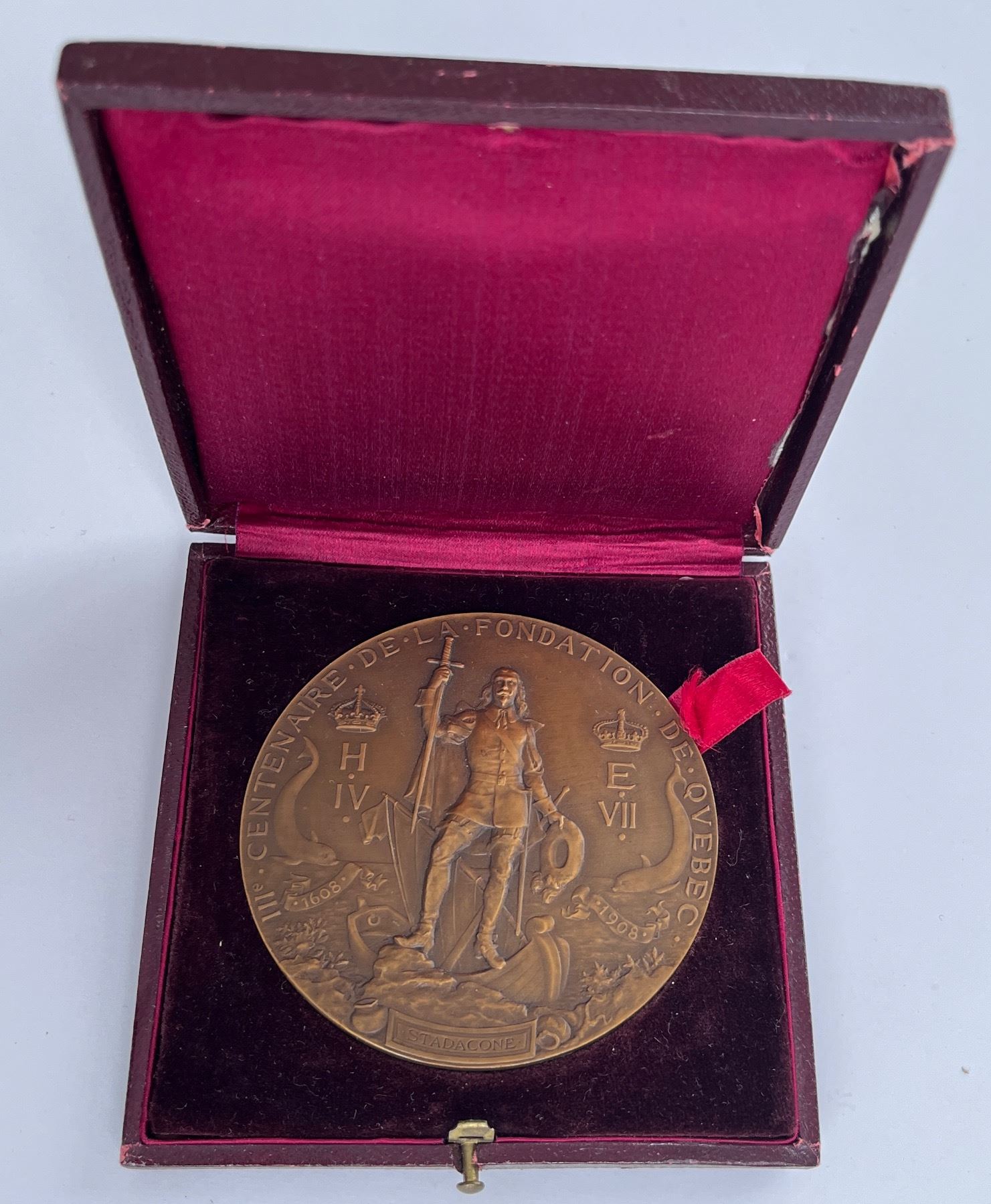 76.3mm. 159.9g. Cornucopia and BRONZE on edge. Signed HENRI DUBOIS. Joe Foster writes in the October 2011 issue of the MCA Advisory that these medals were designed by Canadian Etienne E. Tache and struck at the Paris Mint in the fall of 1909. They were issued in bronze to those who could “prove to be a descendent of the original settlers who had arrived in New France.” Six pieces were struck in gold for high-ranking officials and dignitaries. A popular historical medal featuring Samuel de Champlain stepping off a small sailboat onto the shores of Stadacone, the Iroquoian settlement that would become Quebec. In original case and certificate.
