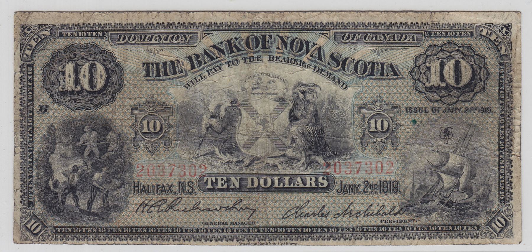 CH 550-18-16. Richardson-Archibald, VG/Fine. A most interesting serial number and seldom seen on a chartered banknote, a RADAR number. Ex: Jared Stapleton. S/N:2037302/B.