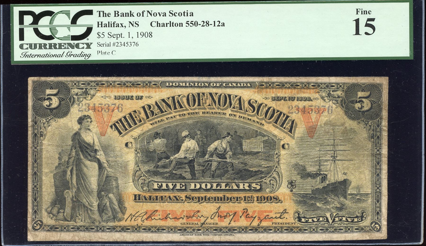 CH 550-28-02a, Orange V's type signatures. PCGS Fine 15. S/N:2345376/C, rare this nice.