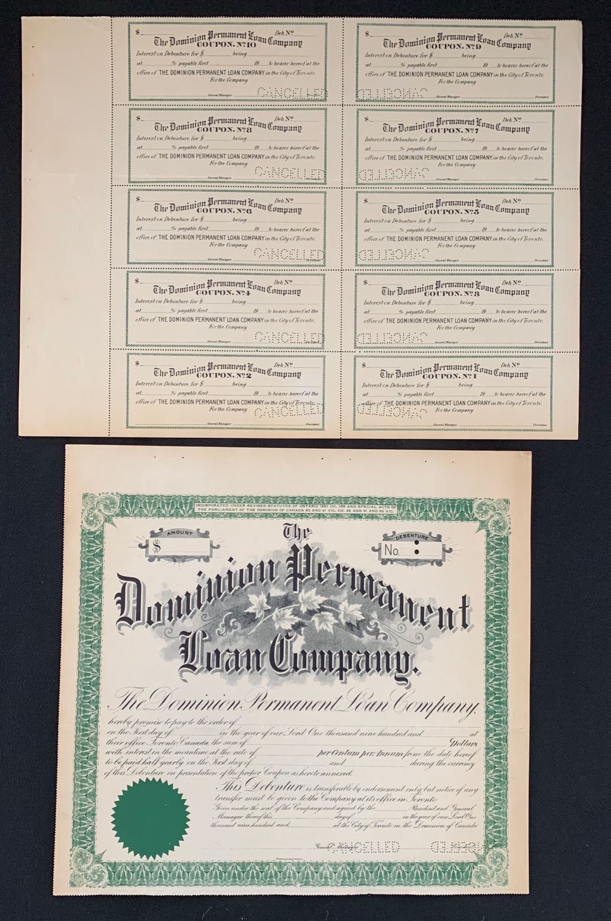 Toronto, 19__, Debenture. Printed in black and green with green seal by Rolph and Clark, Toronto, Remainder or record copy, perf and punch cancelled. VF+ condition. A sheet of ten interest coupons, perf cancelled, AU condition, has been separated and is included. The company had previously been named the Dominion Building and Loan Association, until 1898.