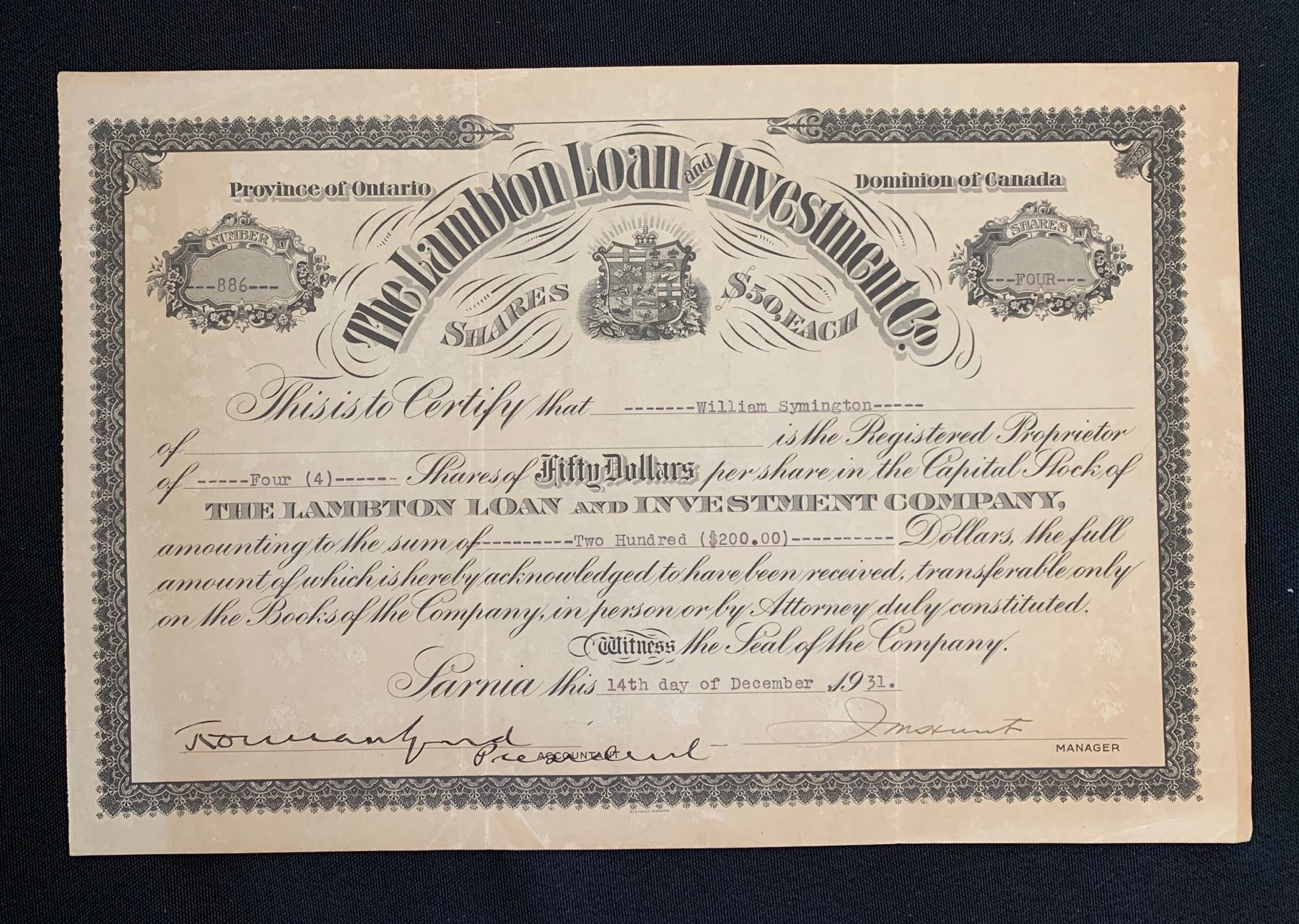 Sarnia, Stock Certificate for 4 $50 shares, 1931. Signed by the President from 1914 to 1943, Norman Gurd, and Manager, J. M. Hunt. Mr. Hunt served in that position for thirty-five years, ending with his death in 1939. Canada's oldest mortgage company celebrated its centennial in 1944, observing that shareholders never missed a dividend. It invested in mortgages on properties in Lambton and Kent Counties, as well as Dominion and other high grade bonds. VF, with overall light paper toning.