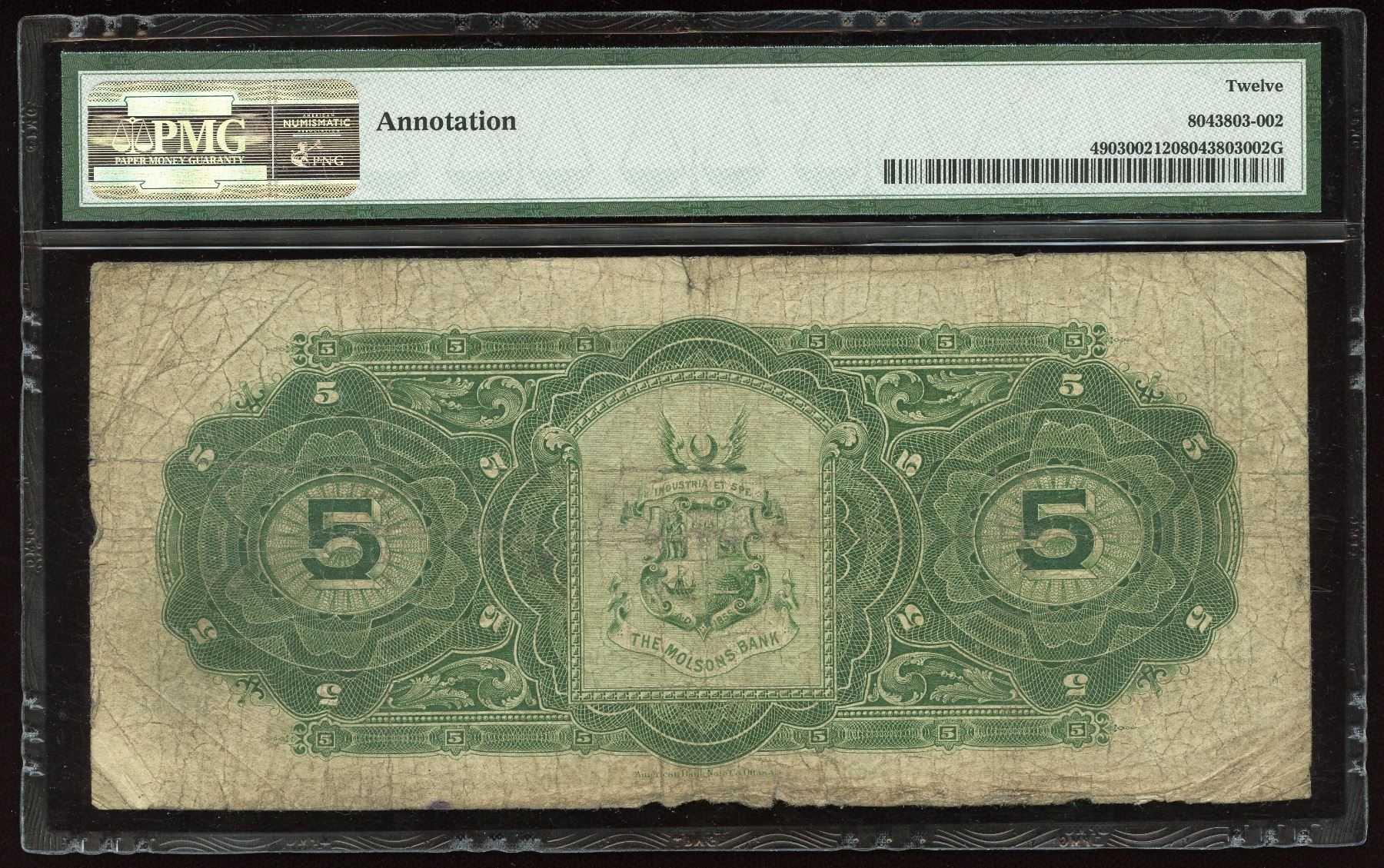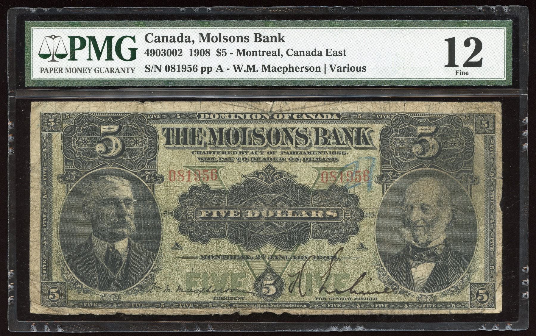 CH 490-30-02, PMG Fine 12, a nice popular Molsons Bank 1908 $5. A note not often seen. S/N:081956/A.