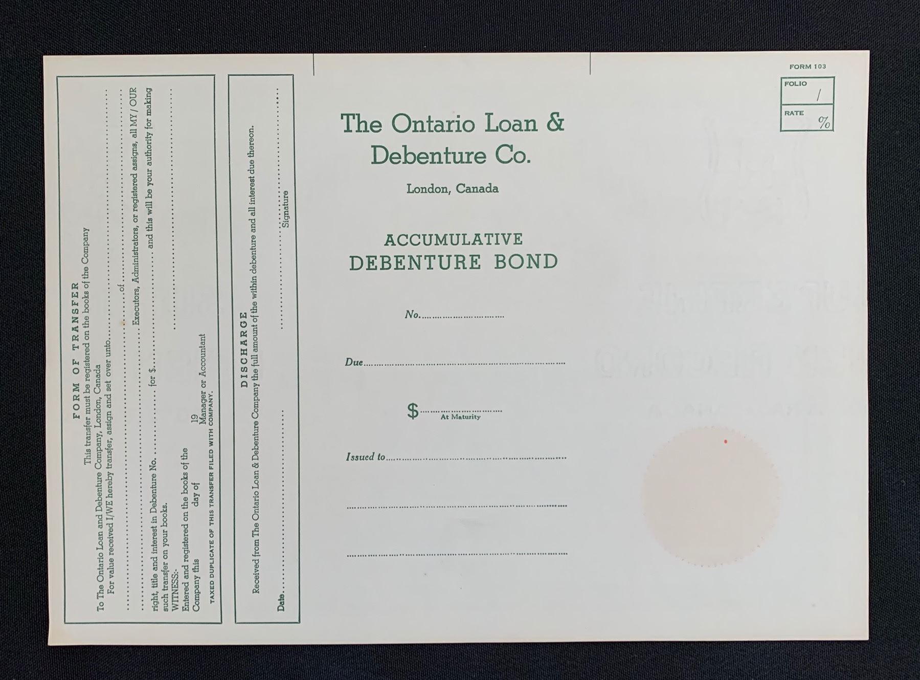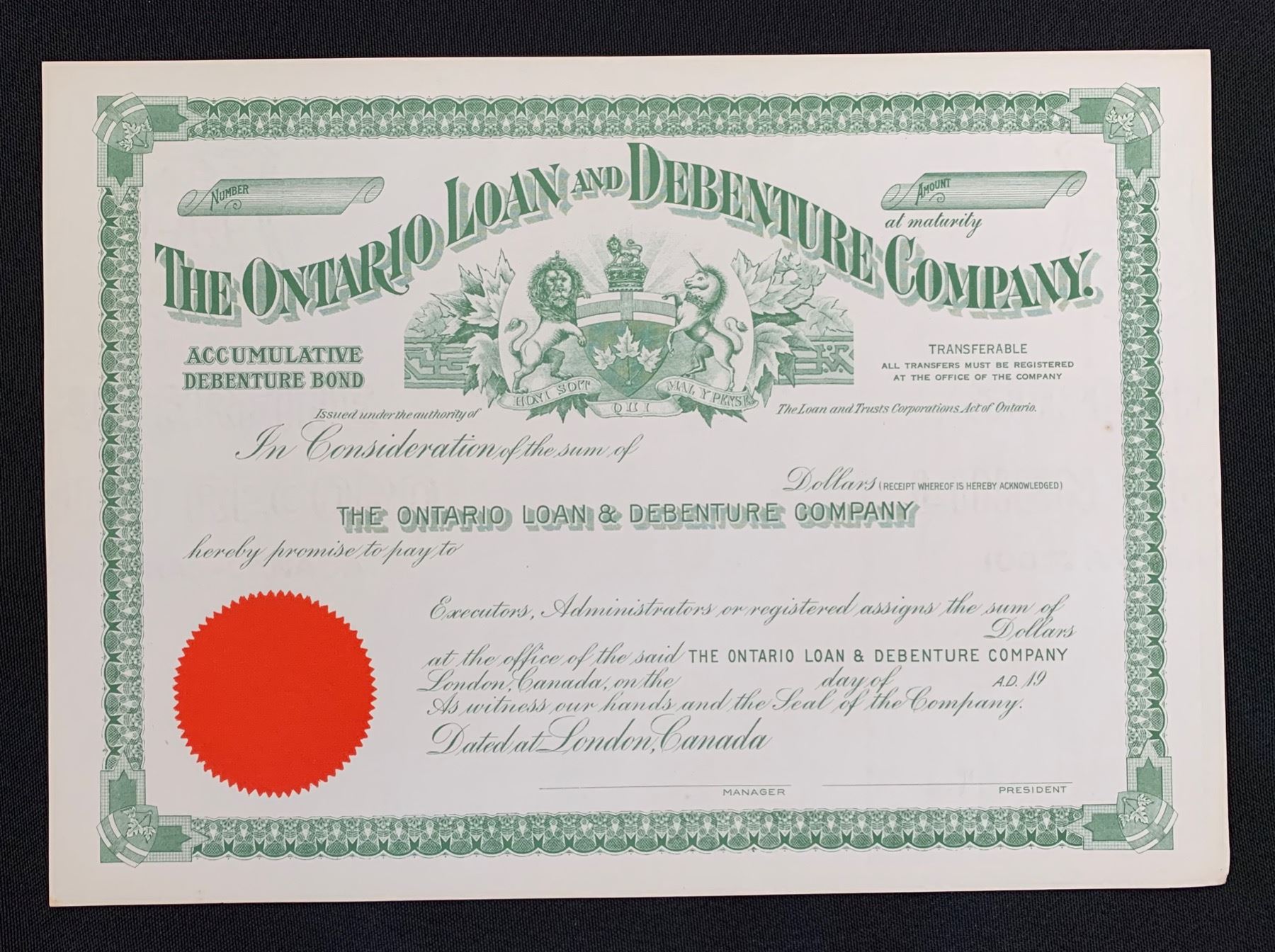 London, Debenture Bond, 19__, Remainder or record copy, printed in green ink with red seal. The firm was incorporated in Ontario in 1870 and was taken over by Royal Trust Co. in 1968. One gently bent corner, otherwise new condition.
