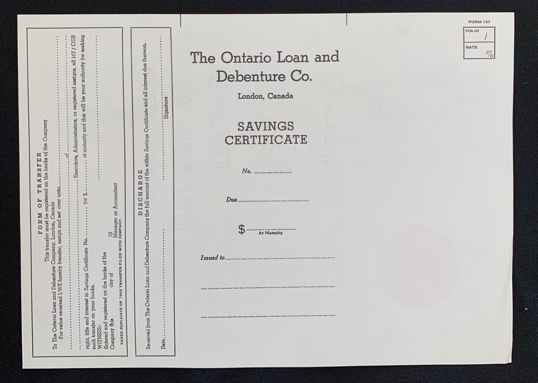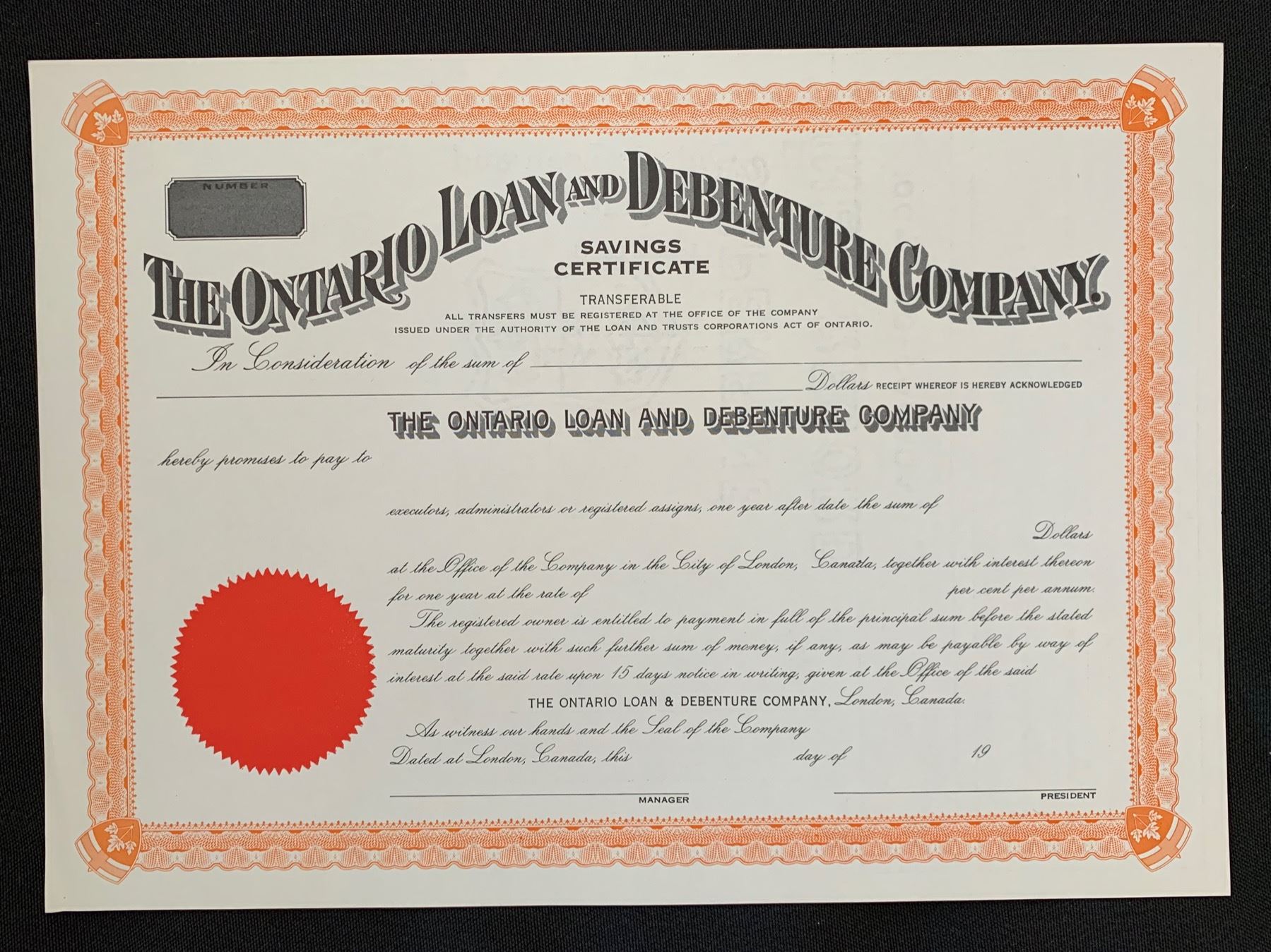 London, Savings Certificate, 19__, Remainder. Printed in orange and black ink with red seal, black printing on back. As new.