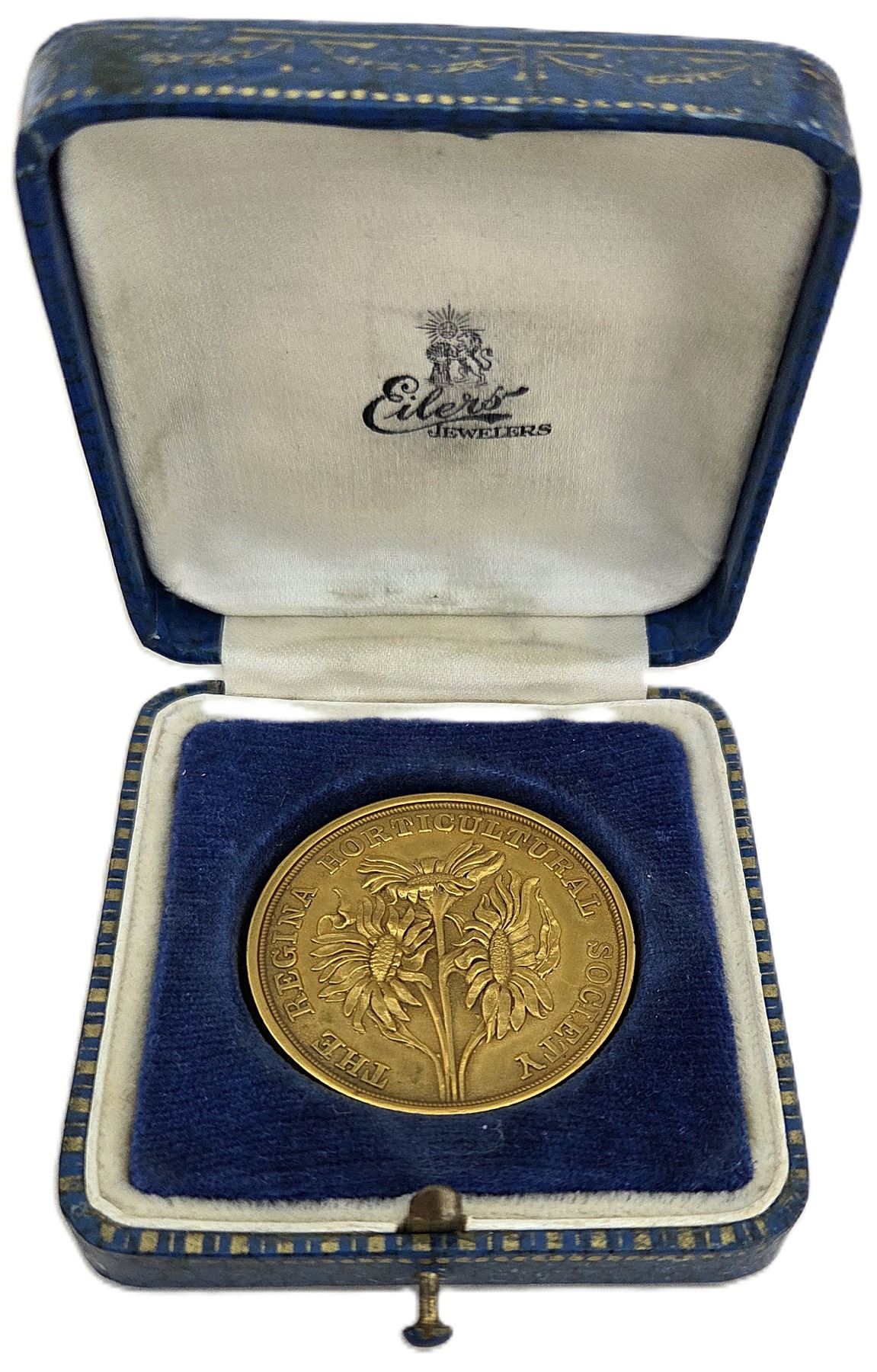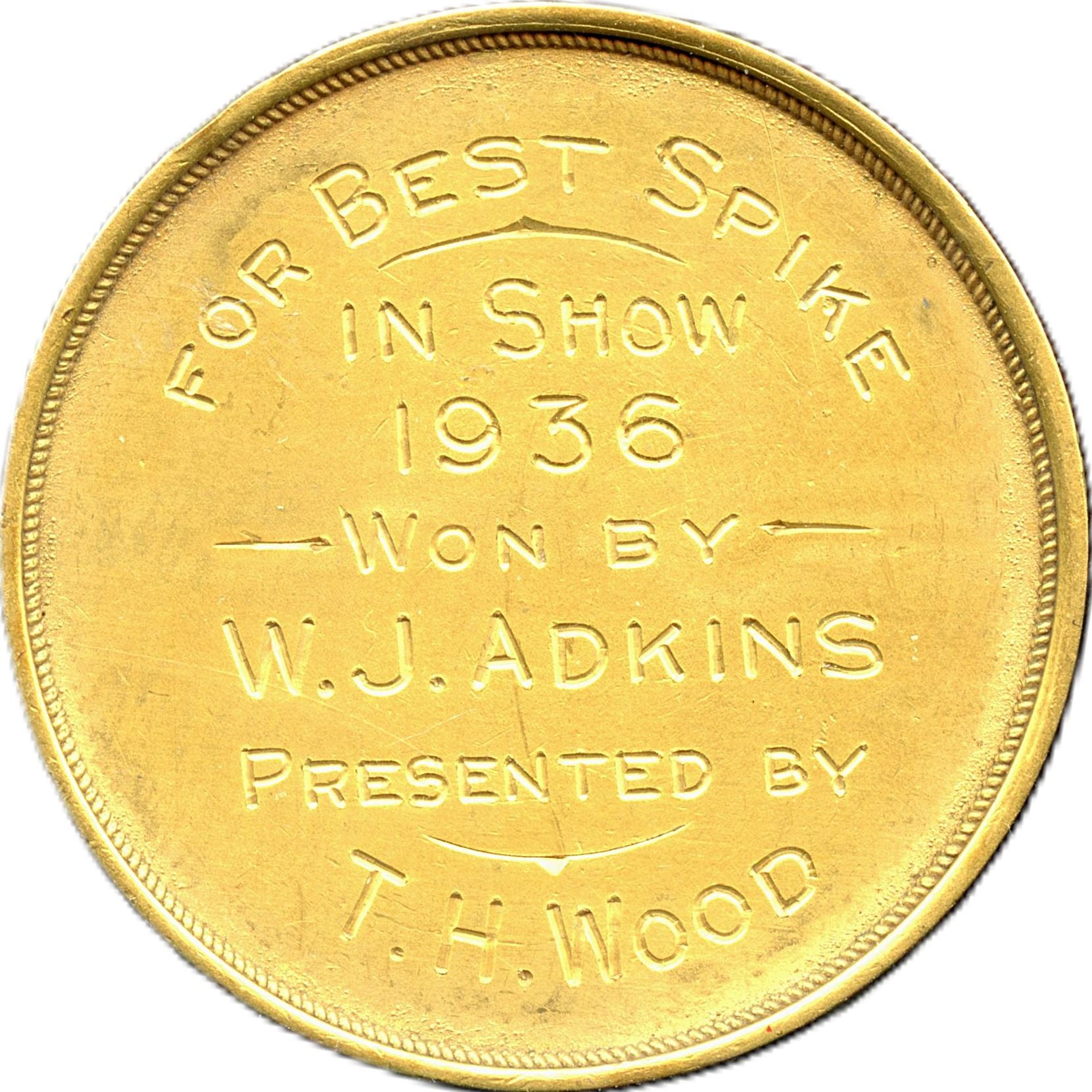 Signed Eilero, For Best Spike In Show 1936 Won By "W.J. Adkins" Presented By T.H. Wood, 34.8mm, 17.1g (0.3106AGW), Housed in its original blue paper wooden box with blue velvet and white satin interior, EF. 1pc. From the Geoffrey Bell Collection.