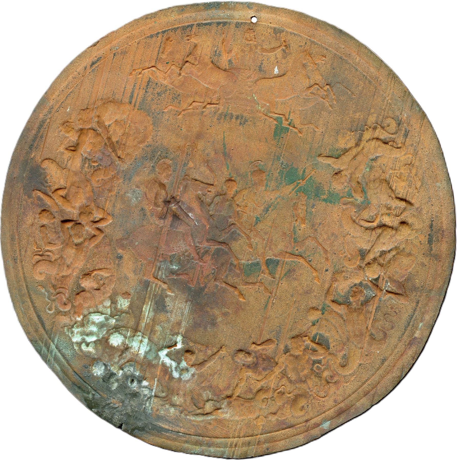 The Reverse Of The 1815 Battle of Waterloo Copper Electrotype Medal ND. Eimer 1067, BHM 870, Signed Pistrucci, 136mm, 44.6g. The medal was intended to memorialize the most famous battle of the 19th century, but was never struck, as the dies, when finally finished by Pistrucci, proved to be too large to be practical for even the Royal Mint's massive medal press. Circa 1852. Once mounted, small hole at 12 o'clock on rim, split at 5 o'clock up through figure extending 27mm. Scarce. Nice chocolate colour, EF. Ex. Wm. John Keast (1893-1948)