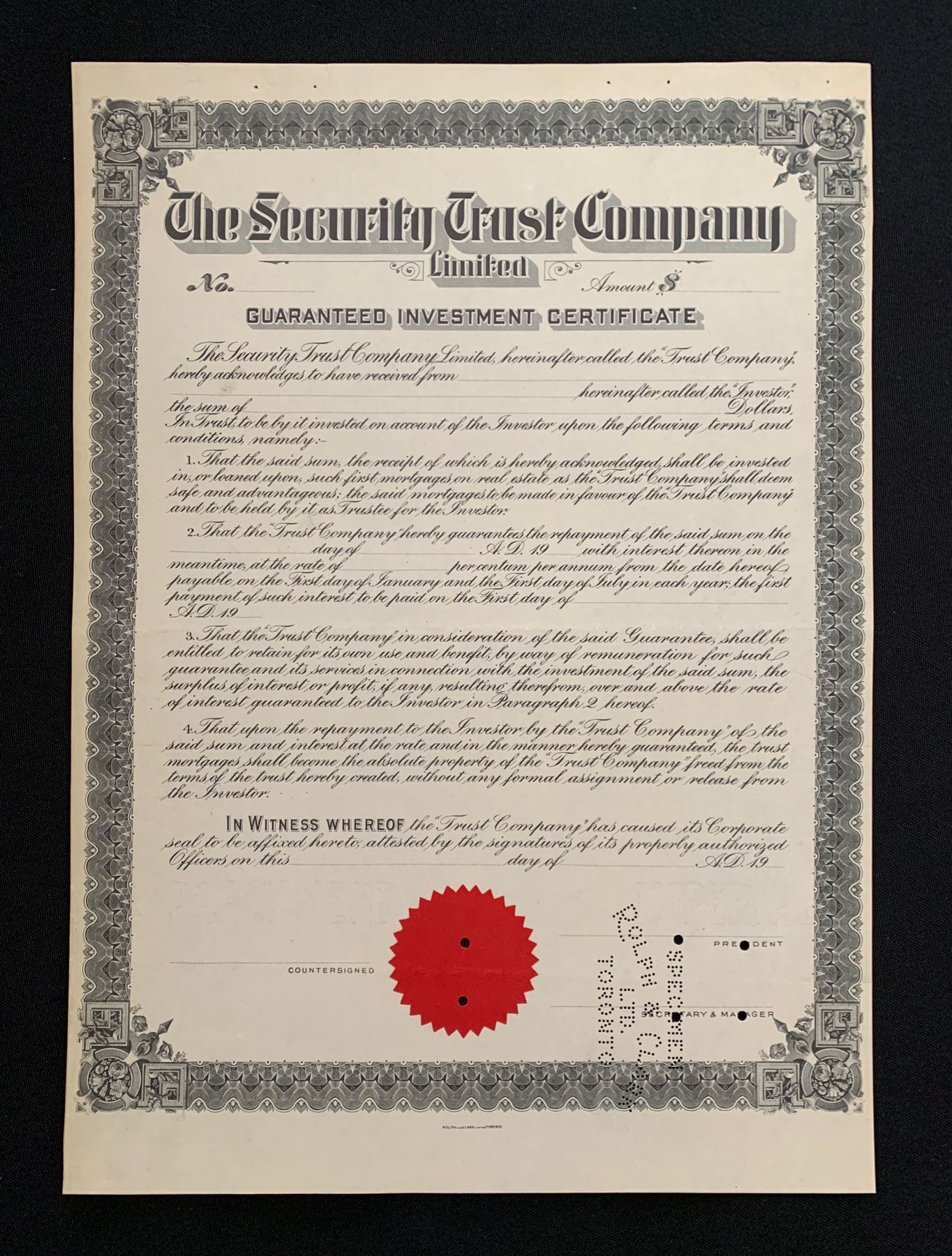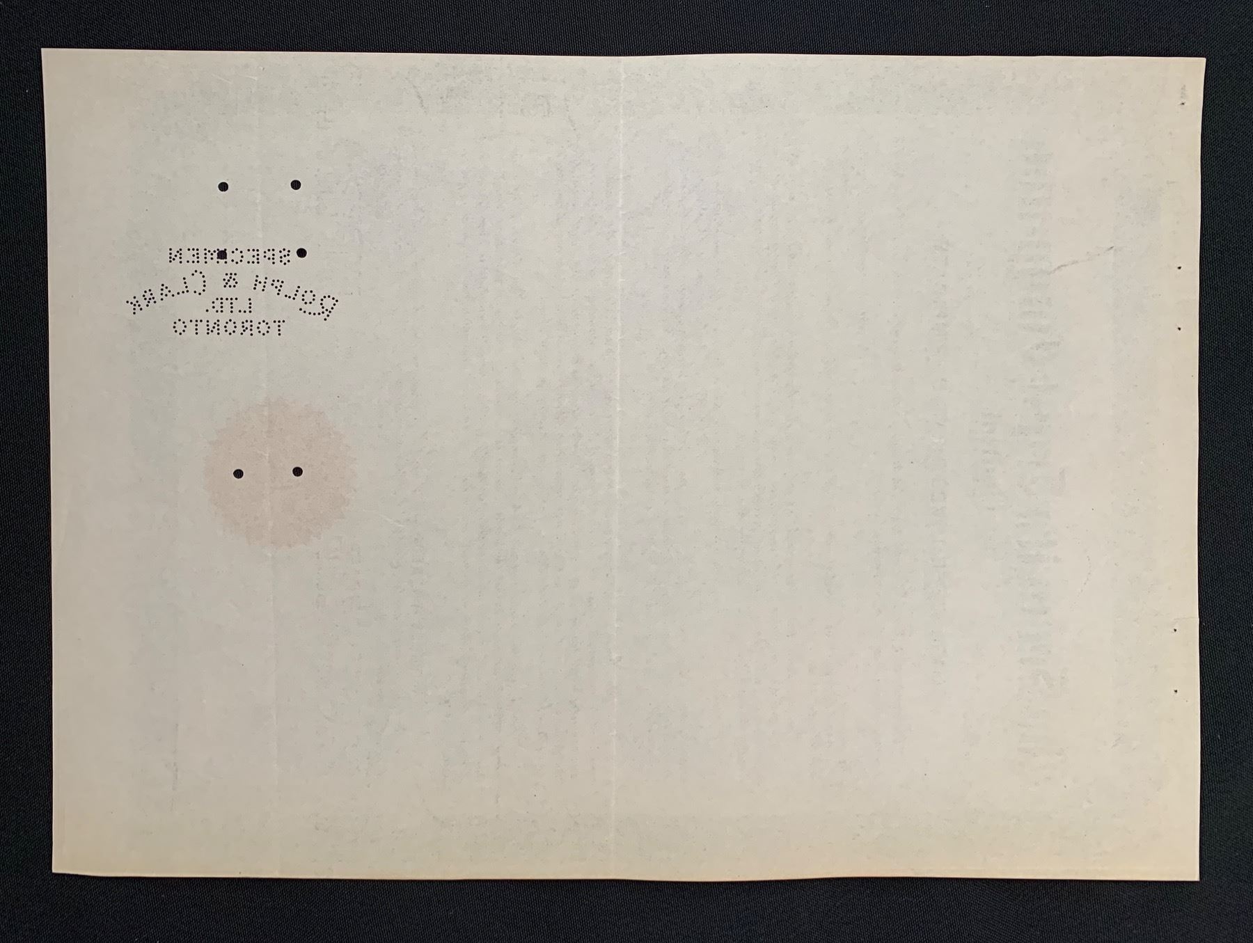 Calgary, Guaranteed Investment Certificate, 19__. Specimen, printed in black with red seal, by Rolph and Clark, Toronto. Perf cancelled by printer with additional punch cancel holes. VF-EF condition, pinholes in top margin.