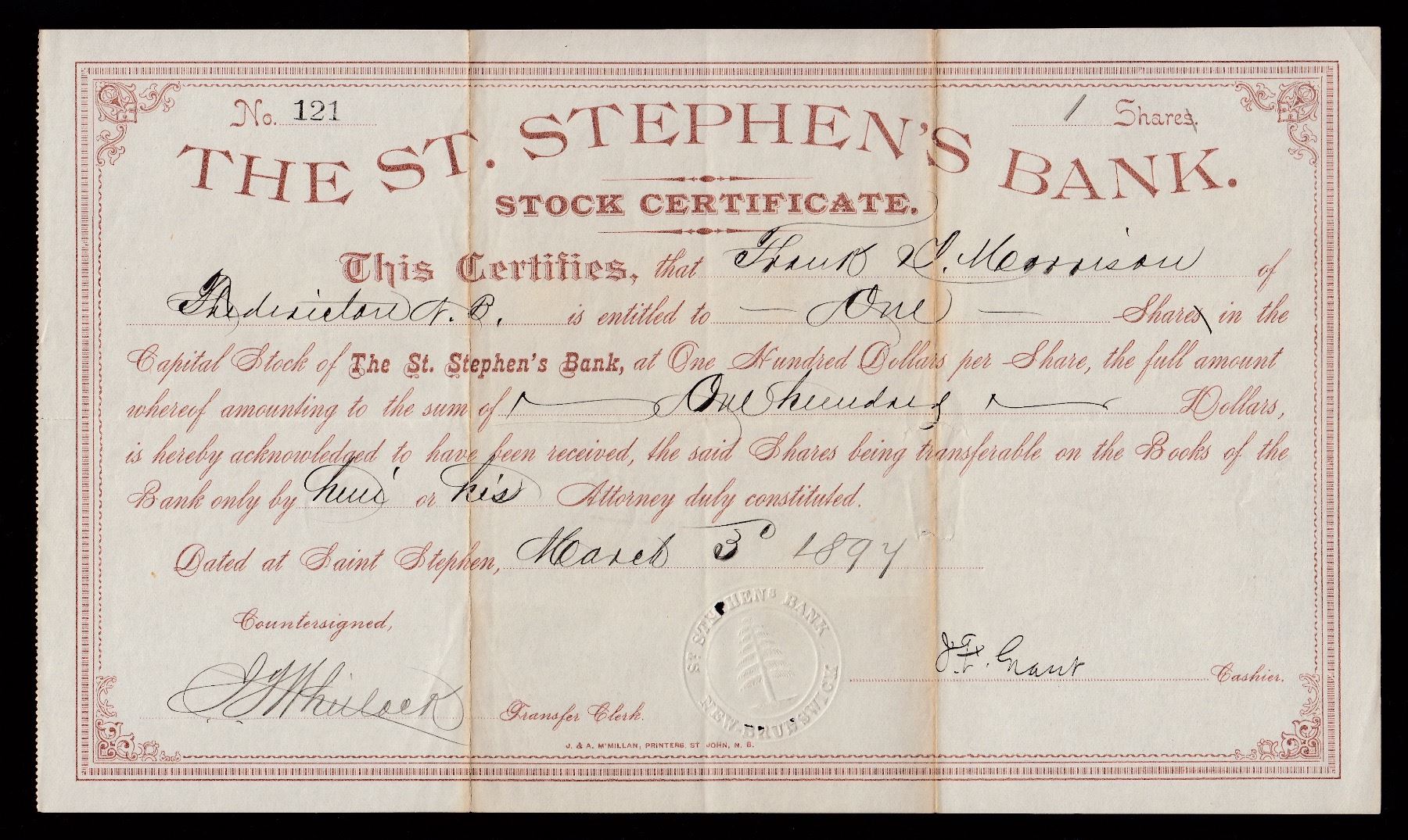 Dated 1897 for one share amounting to a sum of $100. To the best of our knowledge, this bank certificate has not been offered before at public auction, very rare.