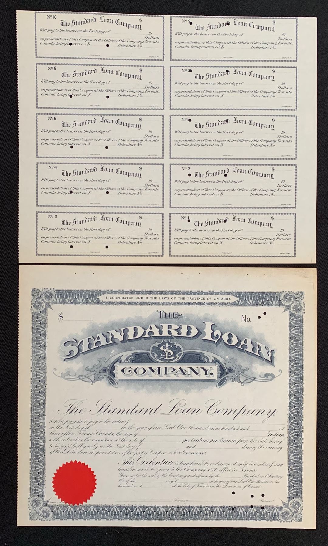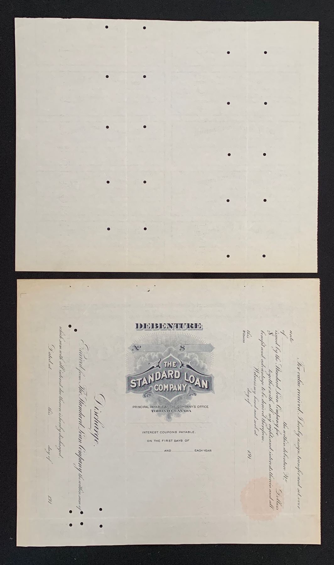 Toronto, Debenture, 191_. Printed in black with red seal, by Rolph and Clark, Toronto; punch cancelled. VF condition, with pin holes at top. Lot also includes a sheet of ten interest coupons, VF-EF.