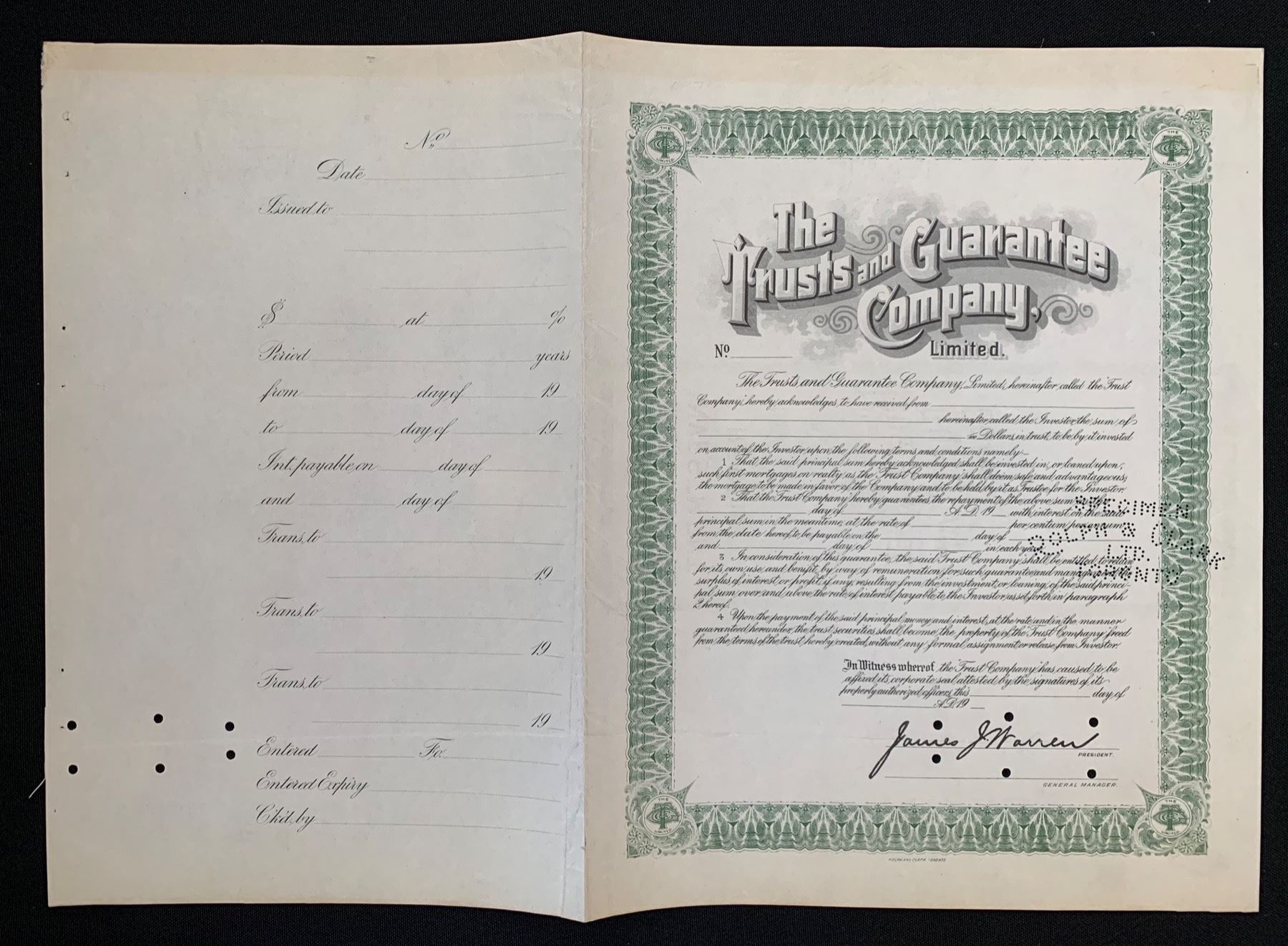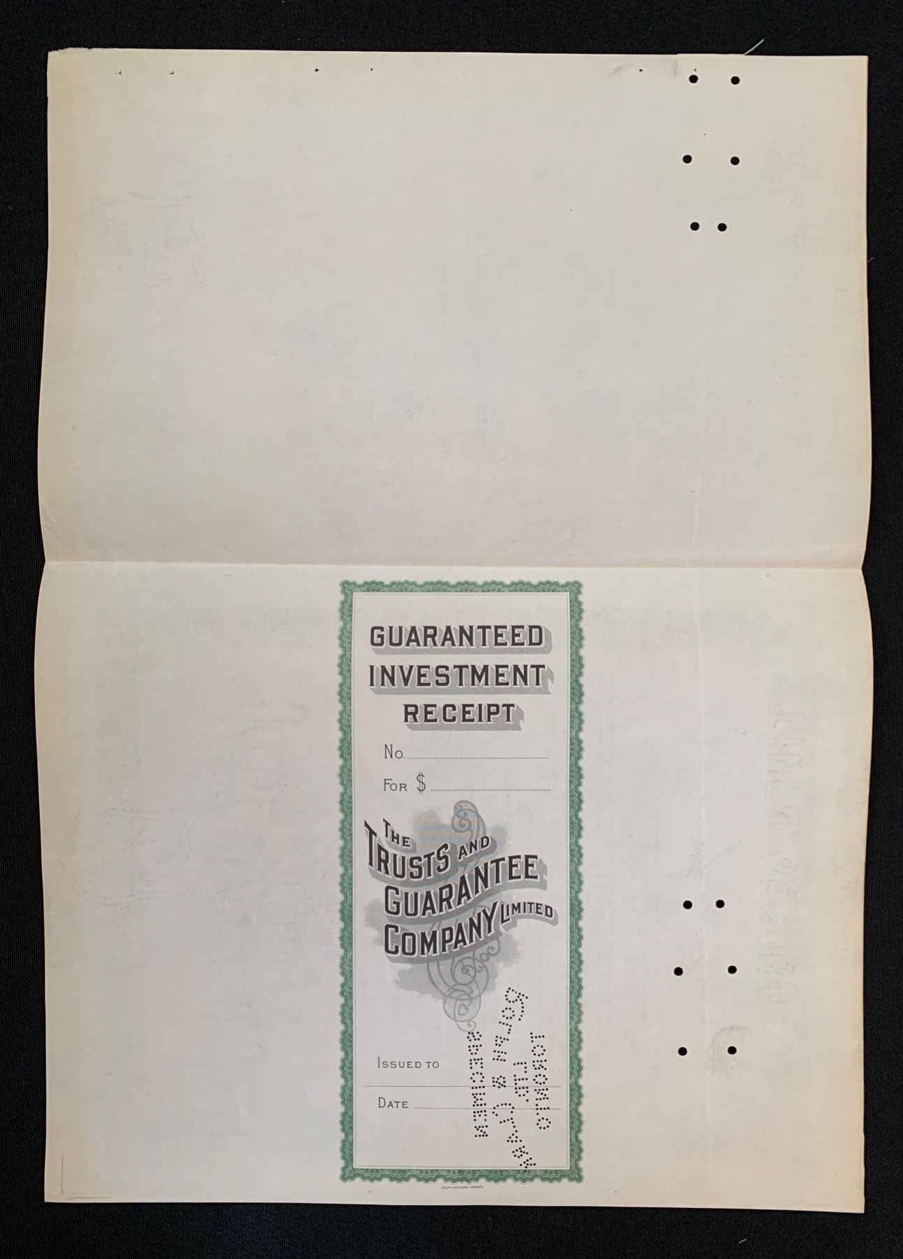 Guaranteed Investment Receipt, 19__, Specimen. Printed in black with green decorative border by Rolph & Clark. Signed James J. Warren (1870-1939), President. Stub is attached. Punch cancelled, EF+ condition. The company was incorporated in Ontario in 1895, with Head Office at Toronto.
