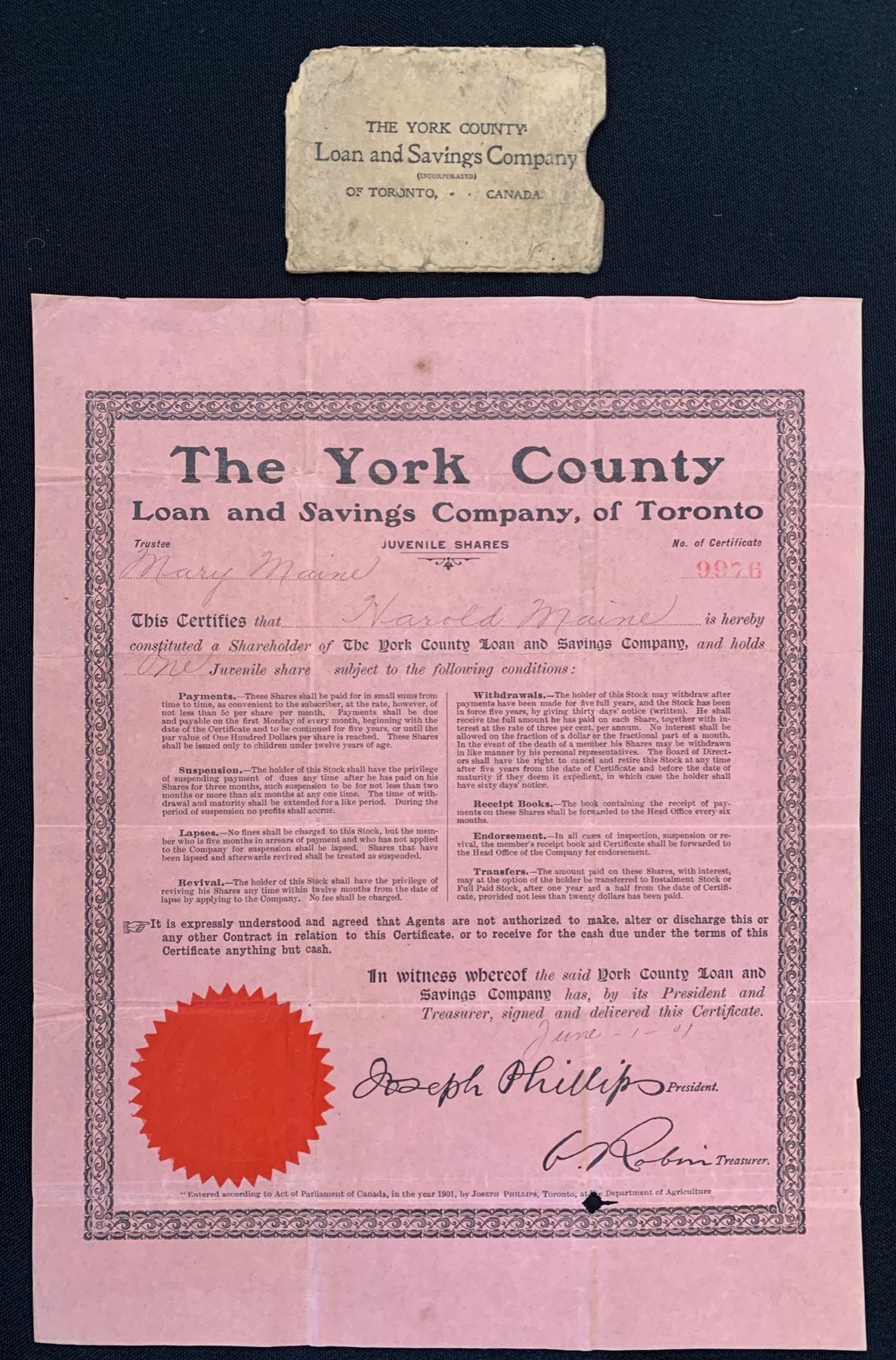 Stock Certificate for one "juvenile share", 1901. Printed in black on pink paper, with red corporate seal. Juvenile shares were issued to children under 12 years of age, who were required to contribute at least five cents per month for five years, or until the par value of $100 had been paid in. Bears printed signatures Joseph Phillips, President, and G. Robin, Treasurer. The business has been described as a Ponzi scheme, and Phillips a scammer. F-VF, with a hole near the bottom. Lot also includes what appears to be a cardboard passbook cover with the name of the same company printed on it, in G condition.