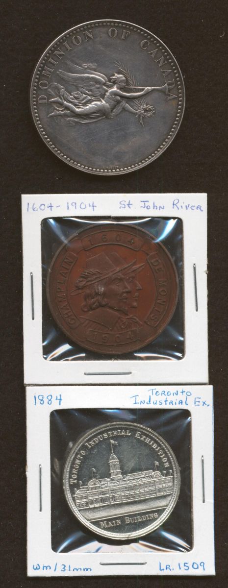 1876 silver Dominion of Canada unawarded, 1904 Champlain-DeMonts, Saint John, NB., 1884 Toronto Industrial Exhibition, UNC