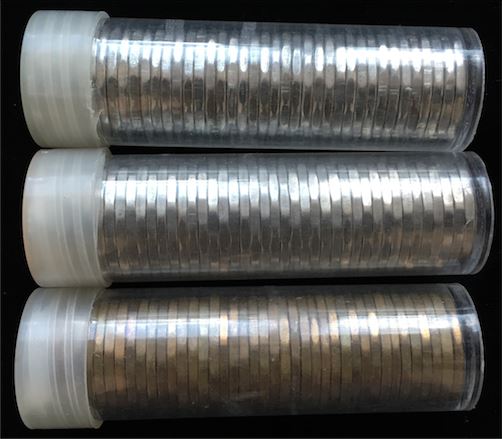 Three Uncirculated Rolls of Five Cents Roll of 1943 V, Brass; 1945 V; 1951 Commemoratives. 3 Rolls