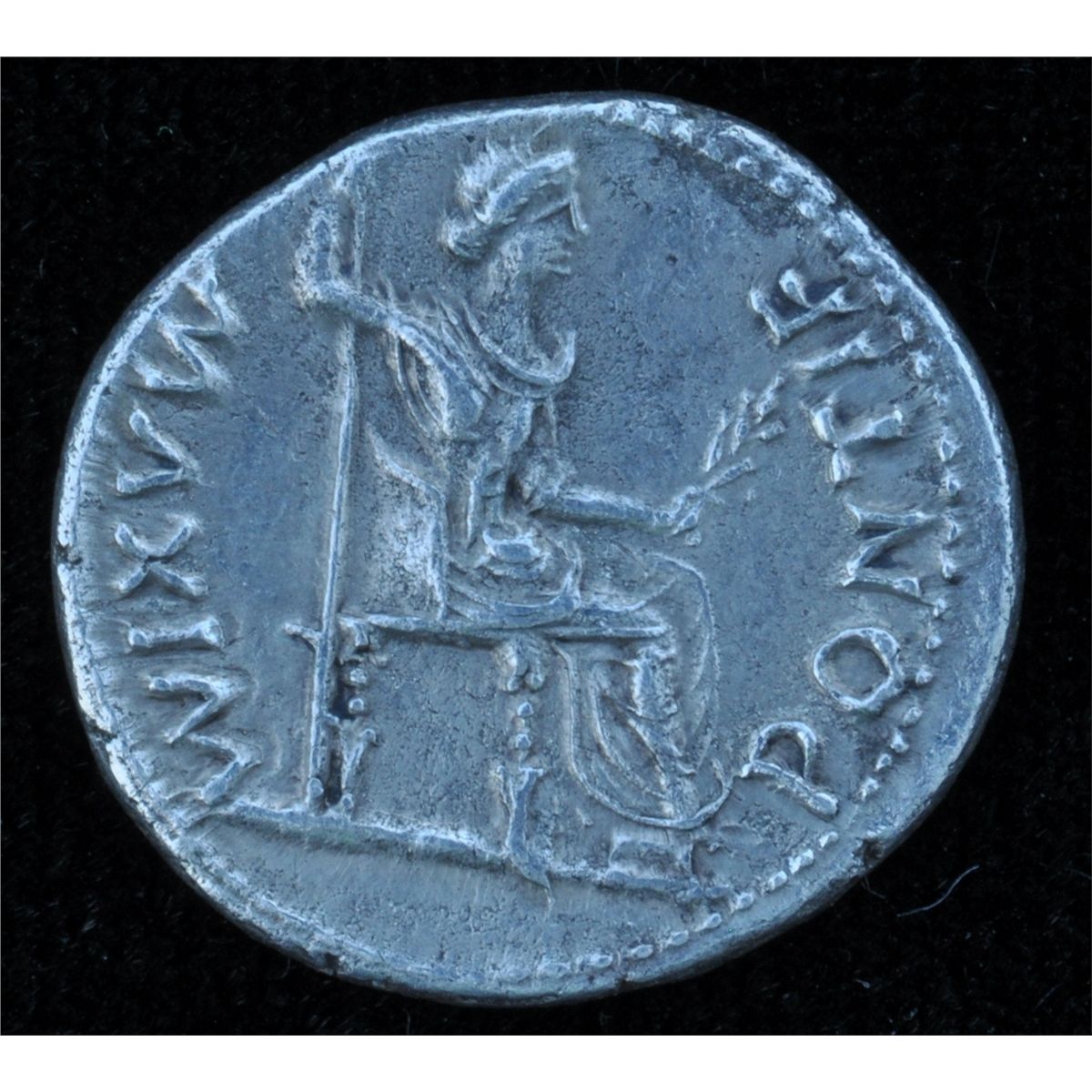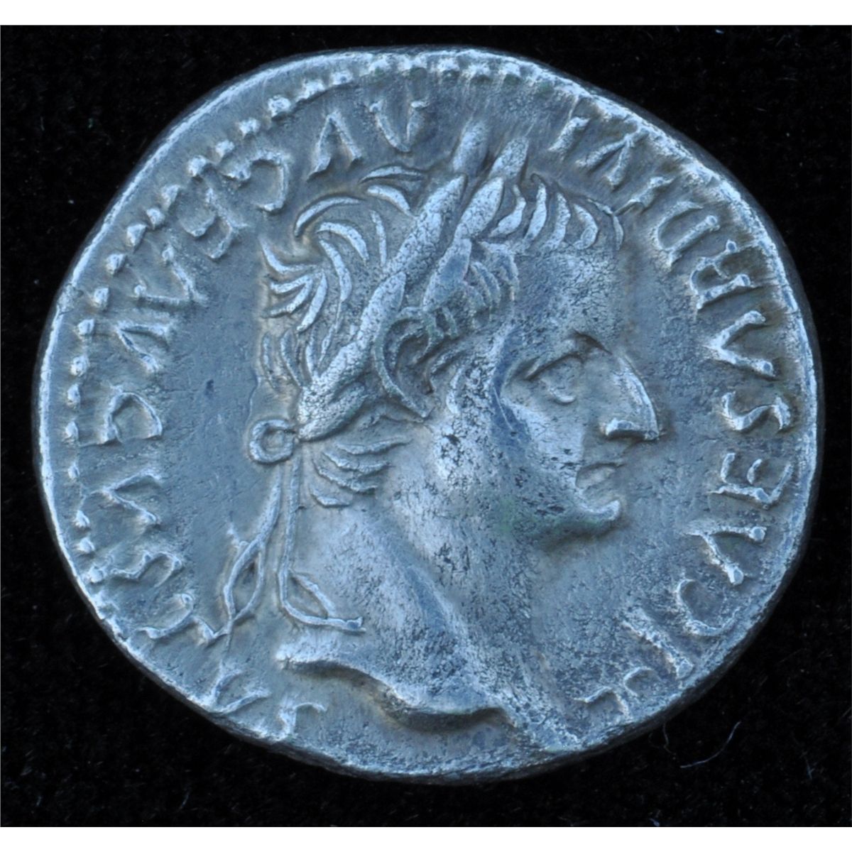 Tiberius (14 - 37 AD) - AR-Denarius Lugdunum, circa 16 AD. Obv: Laur. hd. R., TI CAESAR DIVI AVG R AVGVSTVS. Rev: Female figure seated r., holding scepter and branch PONTIF MAXIM. 3.7 grams S-1763. This is the “TRIBUTE PENNY” of the Bible. Great portrait of Tiberius. EF.