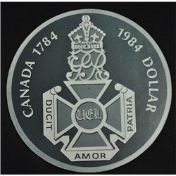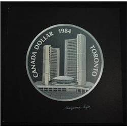 Another proposed 1984 cased silver dollar design by Raymond Taylor. It features a crest of the United Empire Loyalists with 1784-1984. The crest has t