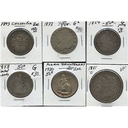 50c dates include 1833, 1854 (plugged), 1858, 1893 comm., 1920 comm., and a 1881O Morgan dollar, over US$200 Red Book value. 6 Pcs.