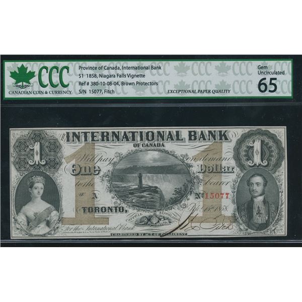 CH 380-10-08-04. CCC Gem Uncirculated 65 EPQ, Finch, Brown Protectors with RED serial numbers. Centre Niagara Falls Vignette. S/N:15077