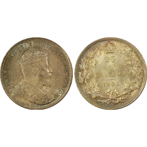 PCGS MS65. Wonderful pedigree on this key date Edward VII quarter. Richly toned obverse with ample luster. Flipping the coin reveals one of the pretti