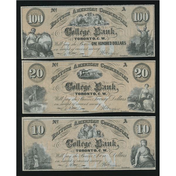 6 notes included in this interesting lot. British American Commercial College Bank, 10, 20 and 100 dollars; a $10 La Banque du College Commercial Mass