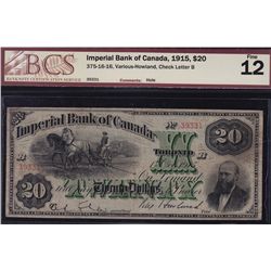 1915 Imperial Bank of Canada $20 - CH 375-16-16, BCS F-12 Hole. 8 known, one in institutional collection. S/N:39331/B.