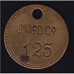 BR 757C, Bowman 596-O-J - J, McD. Co., London, ON., brass, EF, 28 mm, 5.6 gms., top holed, numbered 125, a possible key tag or company tool check?