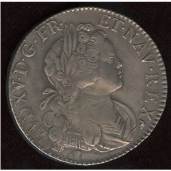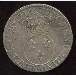 de France, Louis XV, 1719P. The date is off the planchet on the reverse, but appears upside down beneath the bust on the obverse. G & D 297. Fin...