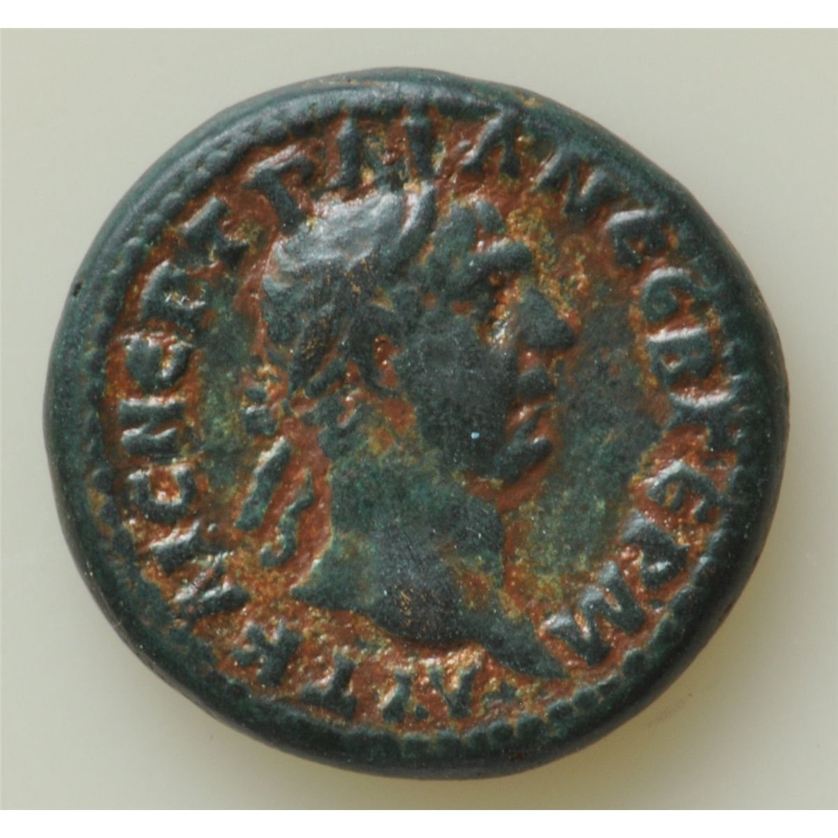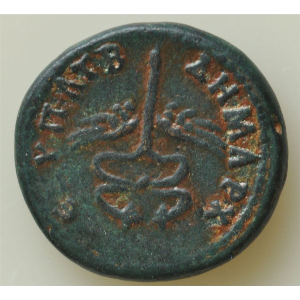 Trajan (98-117 AD) - AE-16 Miletopolis, Mysia Obv: Laur. hd. r. Rev: Winged caduceus 3.9 grams. S-994. EF.