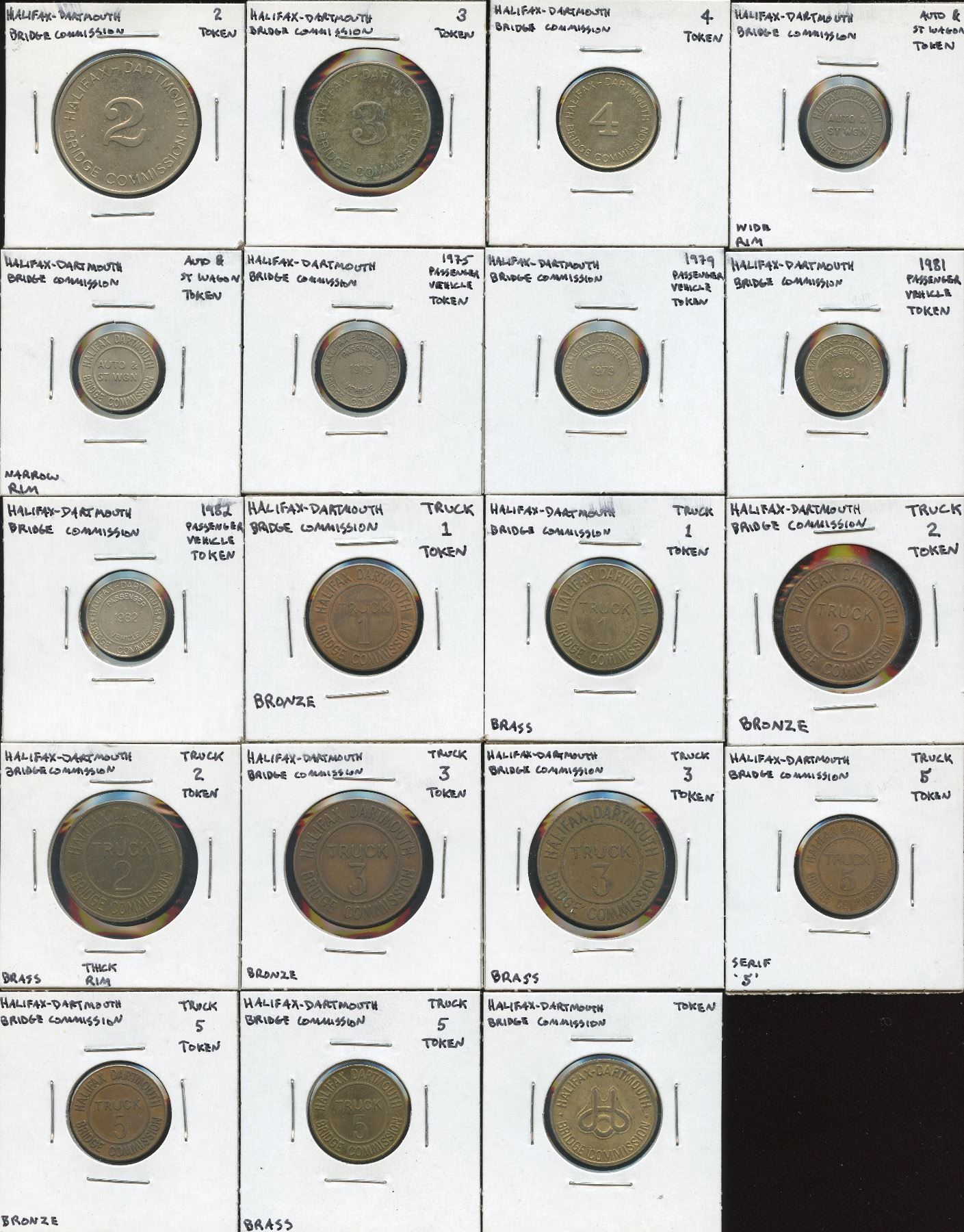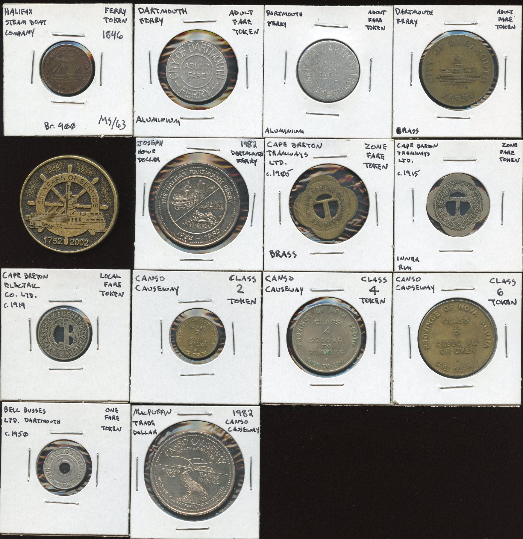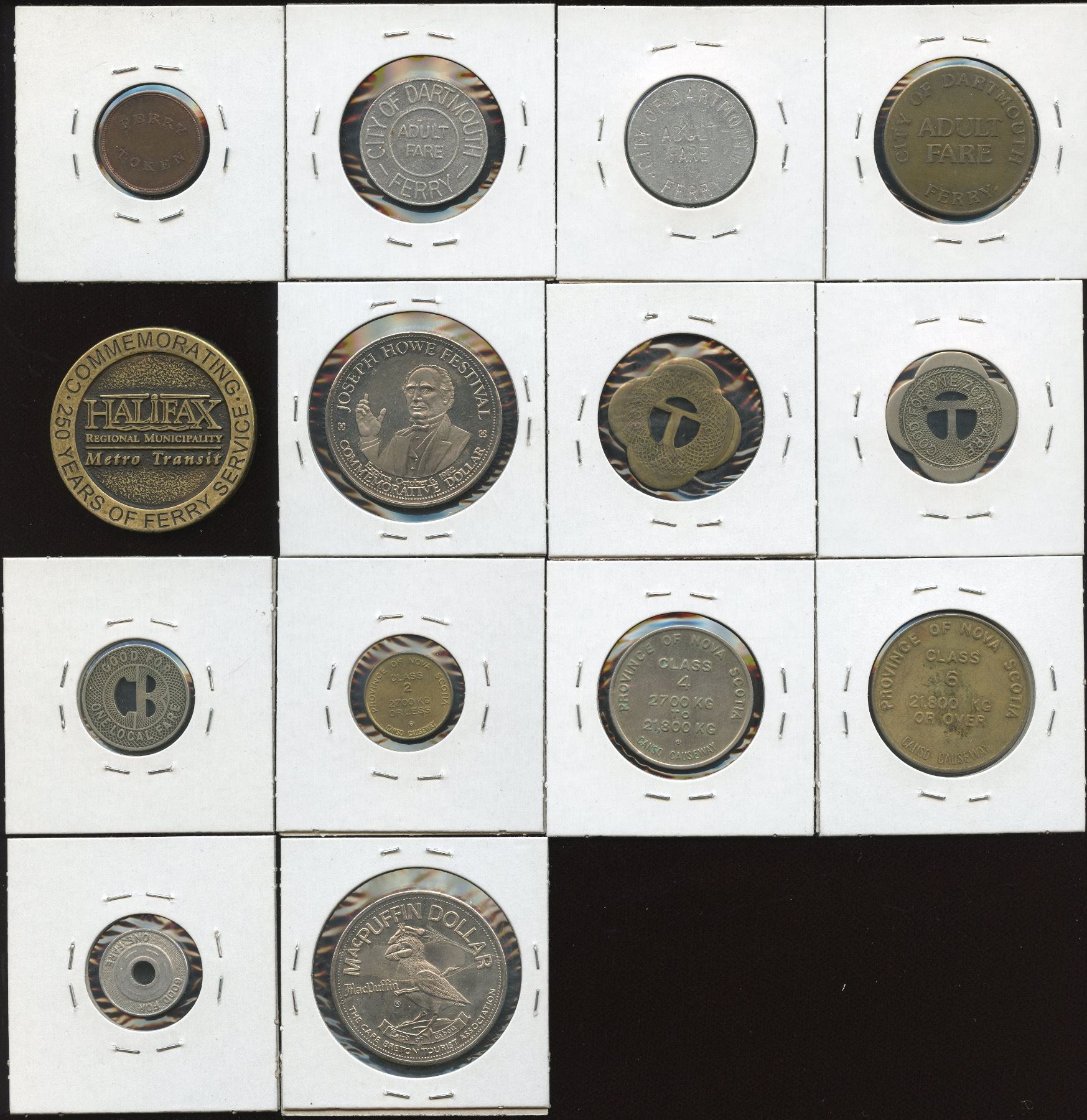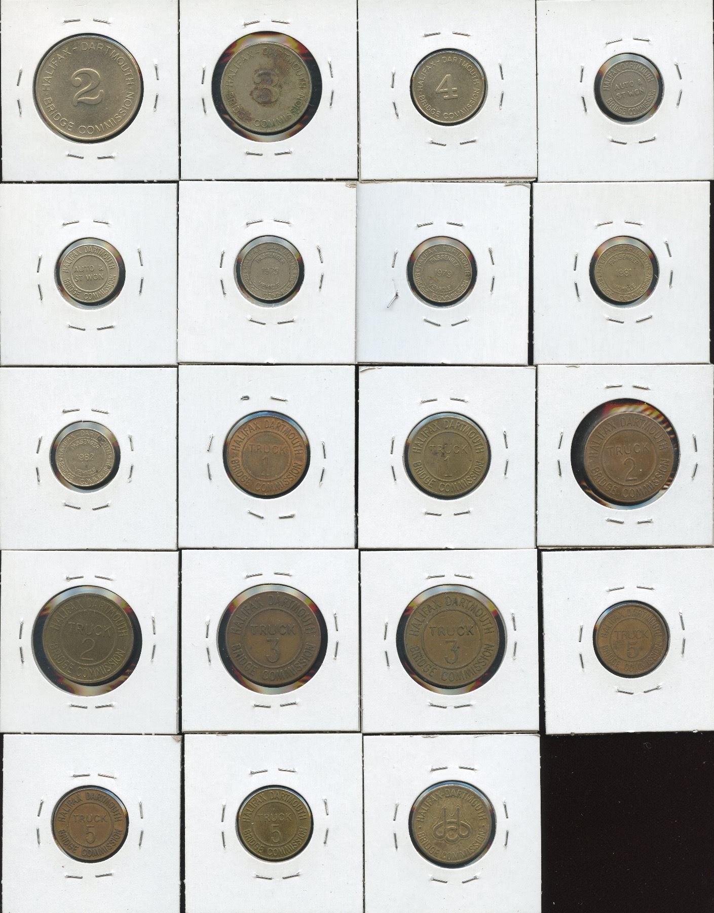 33 Nova Scotia specimens including 19 Halifax-Dartmouth bridge tokens, 3 Canso Causeway tokens, an AU Halifax Steamboat Company (Breton 900), 3 Cape Breton pieces and assorted related specimens.