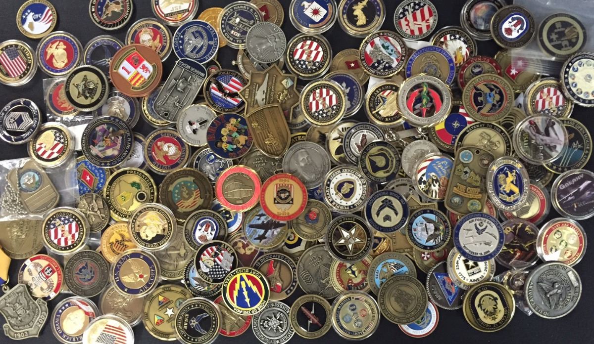 Treasure Chest - 143 challenge coins + 3 challenge pins, 4 different Star Wars Collector Coins, sports cards (4 basketball, 8 football), 24 hockey cards