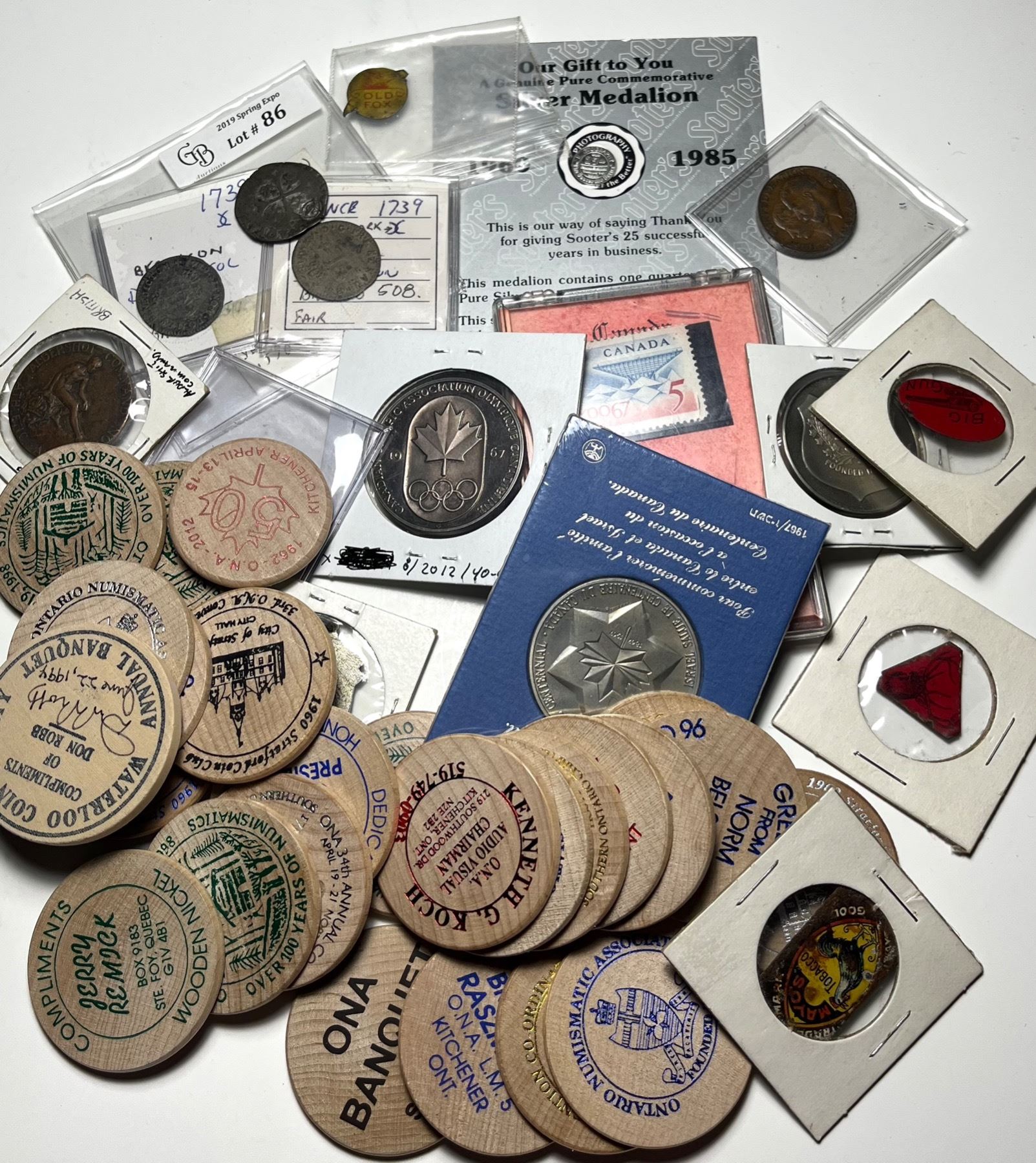 Surprises galore for the lucky buyer. There are 25 ONA woods, 4 very old advertising medalets, 3 French colonial coins, 7 medals, 3 Centennial, a silver postage stamp and a Sooter's silver medallion. We recommend inspection.