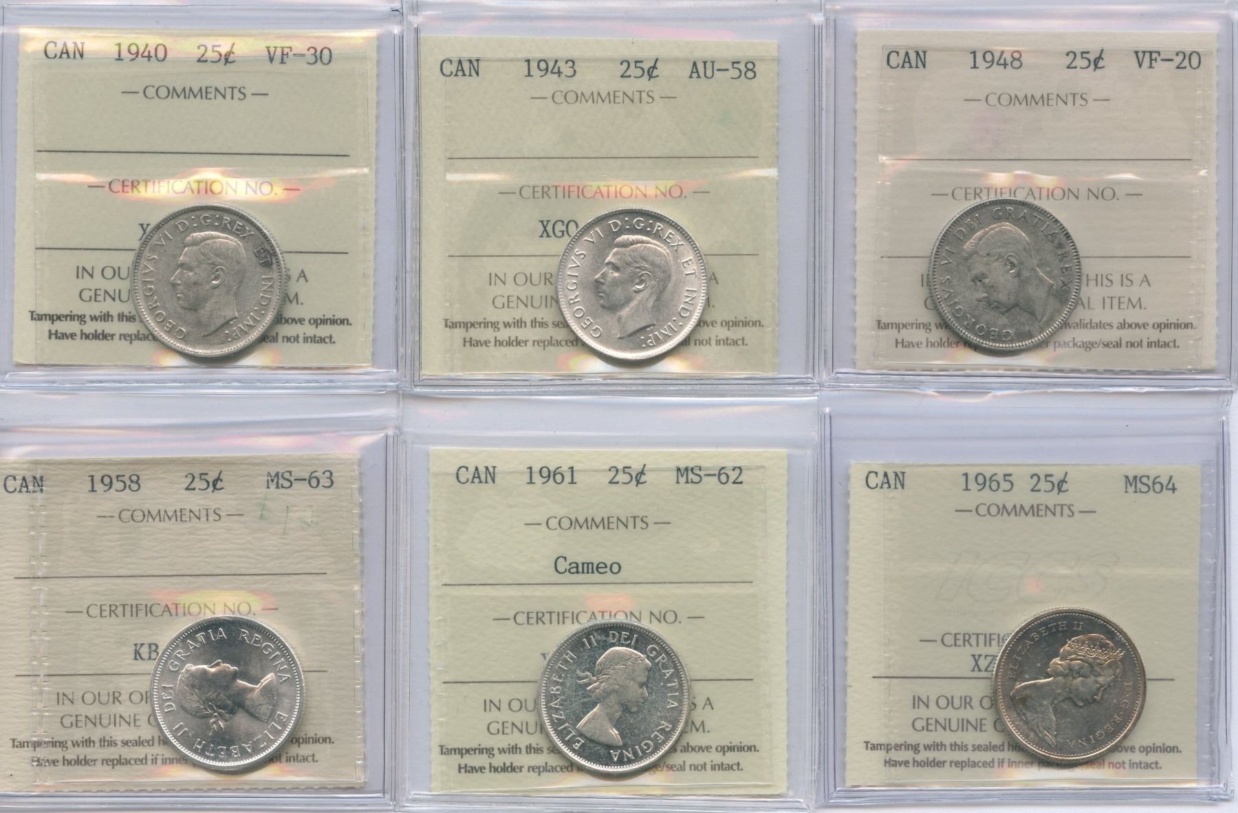 1940 ICCS VF-30 || 1943 ICCS AU-58 || 1948 ICCS VF-20 || 1958 ICCS MS-63 || 1961 ICCS MS-62; Cameo || 1965 ICCS MS64. 6 Pcs.