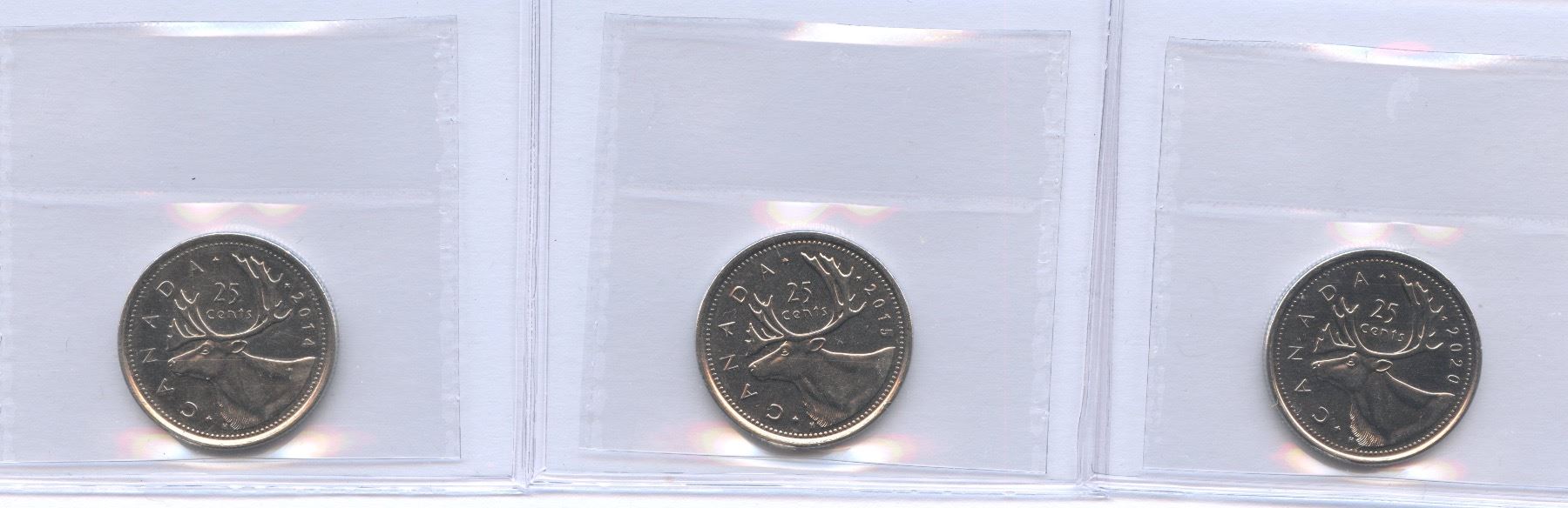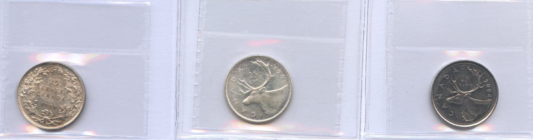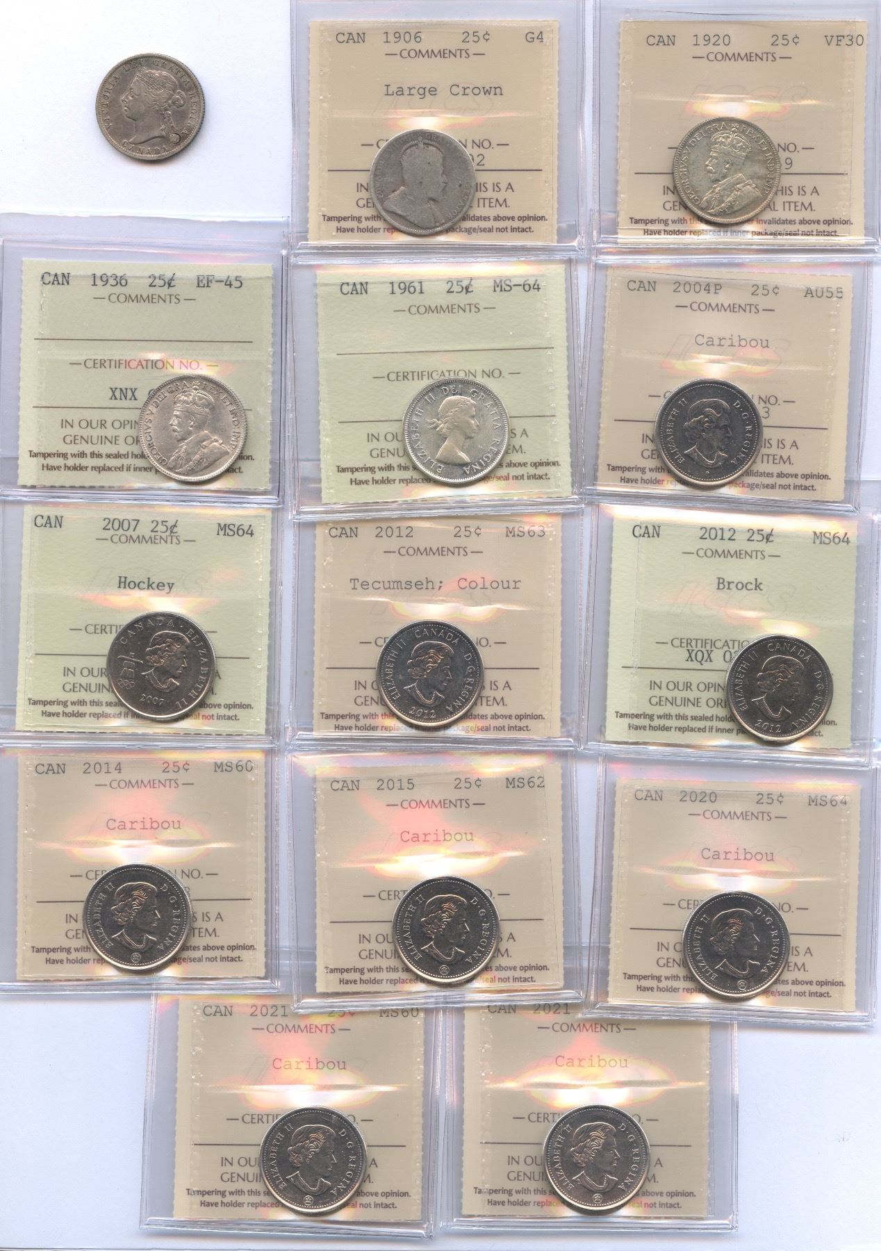 Includes: 1899 plugged, 1906 G4, large crown. 1920 VF30. 1936 EF-45. 1961 MS-64. 2004P AU55, Caribou. 2007 MS64, Hockey. 2012 MS63, Tecumseh; Colour. 2012 MS64, Brock. 2014 MS60, Caribou. 2015 MS62, Caribou. 2020 MS64, Caribou. 2021 MS61 & MS62 Caribou. 10 Pcs.