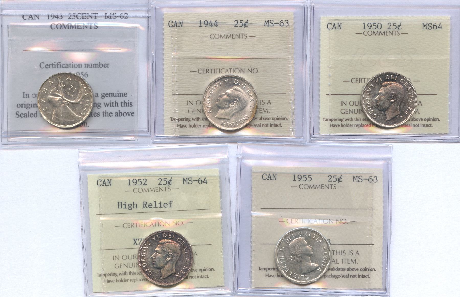 Includes: 1943 PPGS MS-62. 1944 MS-63. 1950 MS64. 1952 MS-64, High Relief. 1955 MS-63. 5 Pcs.