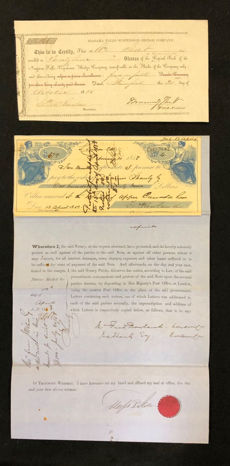 Two interesting Canada West financial documents: Promissory Note 1858, to be paid at the Bank of Upper Canada, London. Printed in blue, adorned with two vignettes of seated women representing commerce and agriculture; pinholes. Note was protested for non-payment, legal document is attached. Secondly, Niagara Suspension Bridge Company share certificate, 1855; the signature of the vice-president appears to be that of Thomas Street, who later became president of the company, and who also signed some of the 1854 notes of the Niagara District Bank.
