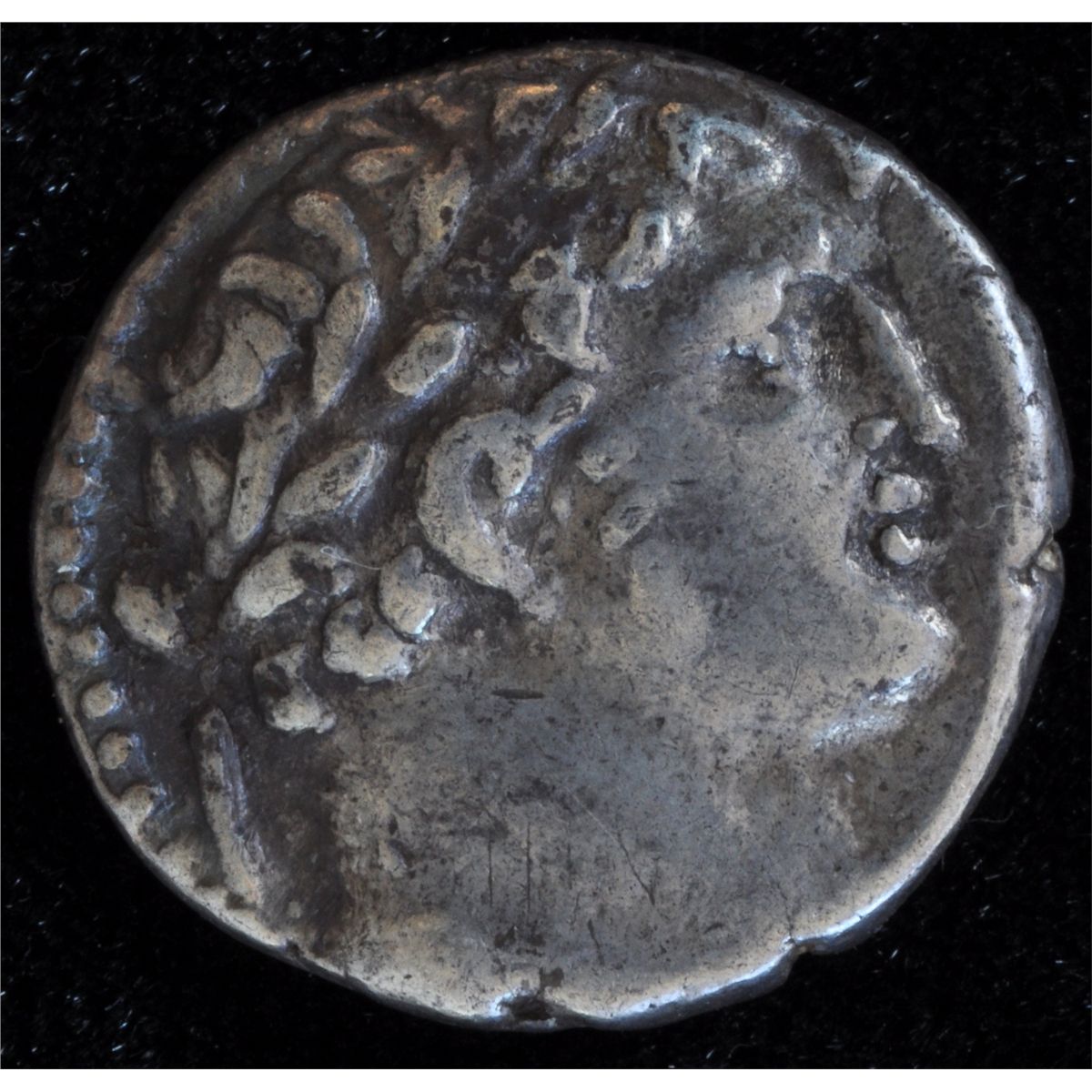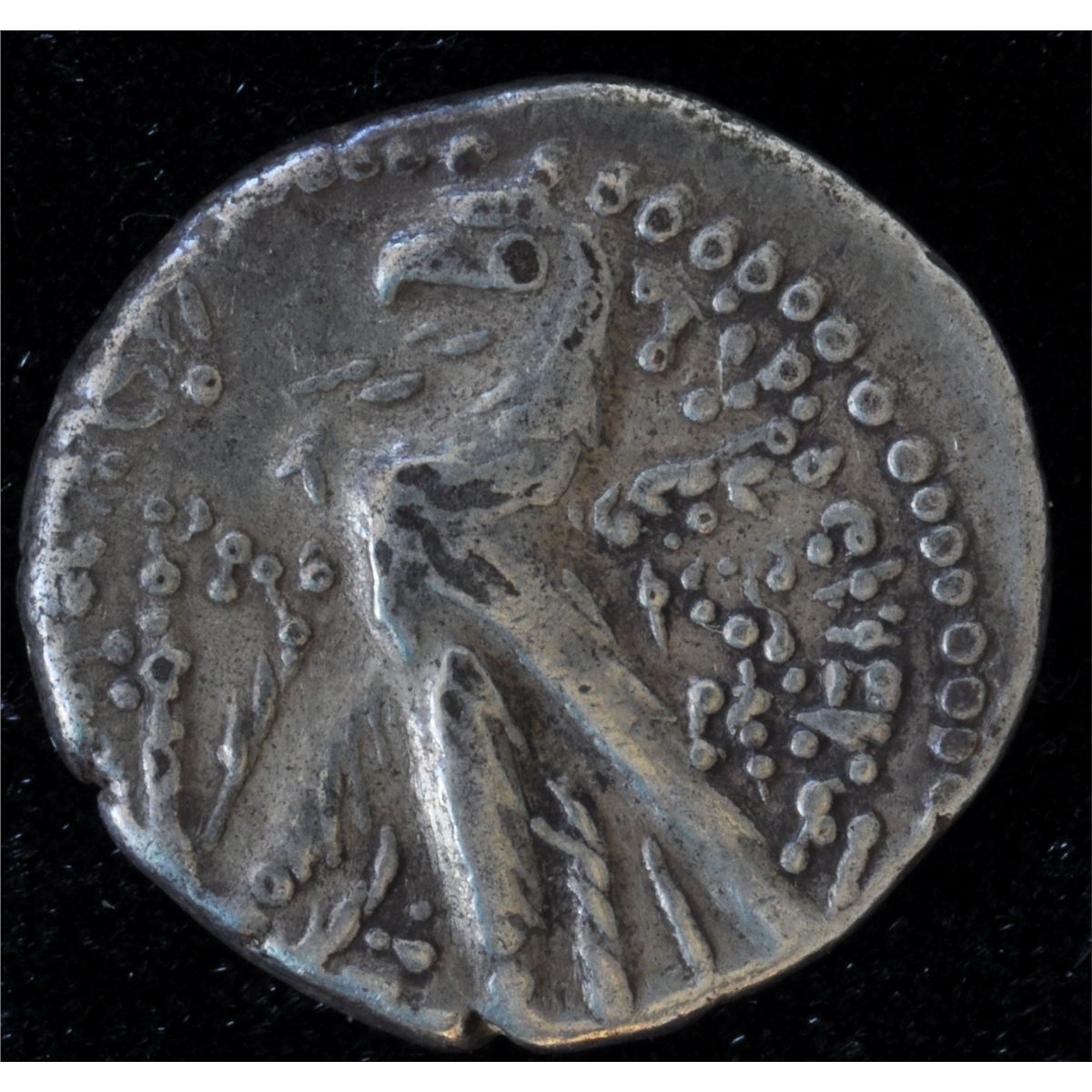 Tyre Half Shekel (126-18 BC) - Obv: Laureate bust of Melqart right, with lion skin tied around neck / TYPOY IEPAS KAI ASULOU Rev: eagle standing left on prow, palm branch under far wing, monogram in right field, Phoenician letter before left claw. Hen 918, Fine.