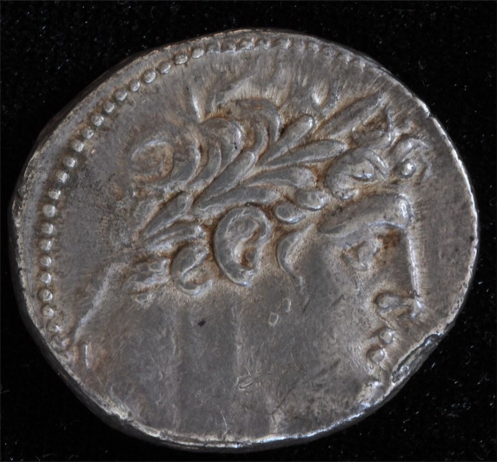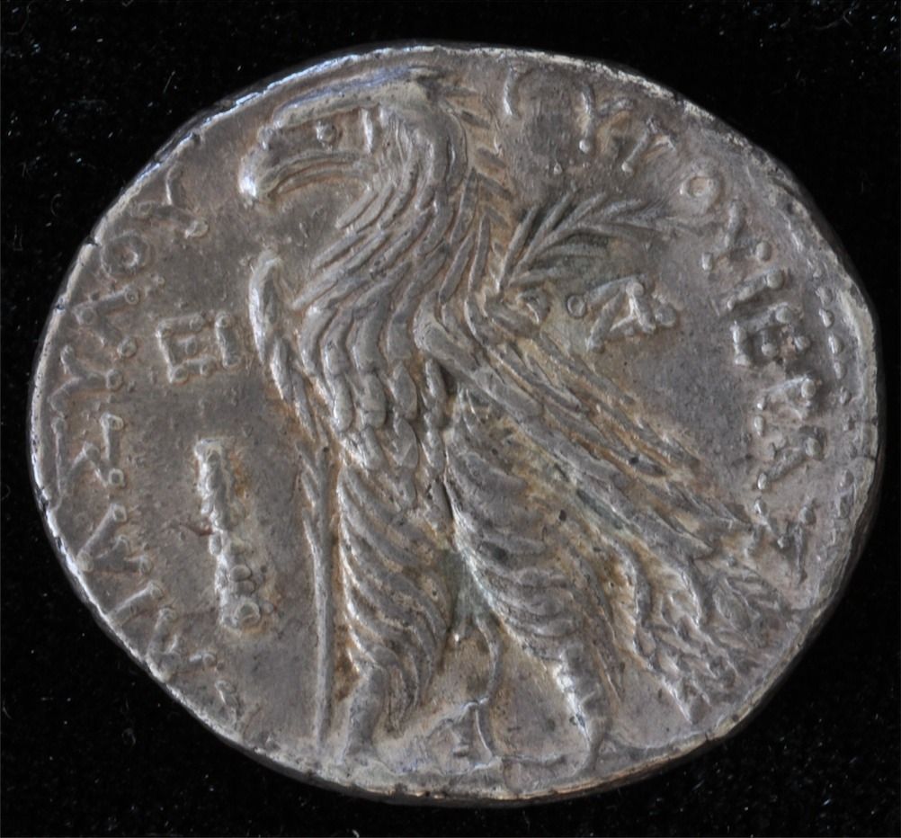 Tyre Shekel (100 BC) - Obv: Laureate bust of Melqart right / TVPOV IEPAS KAI ASULOY Rev: Eagle with closed wings standing left on prow, palm branch under far wing, date EI above club in left field, ZL monogram in right field, 14.3 grams Hen 917, Biblical Reference coin, VF.