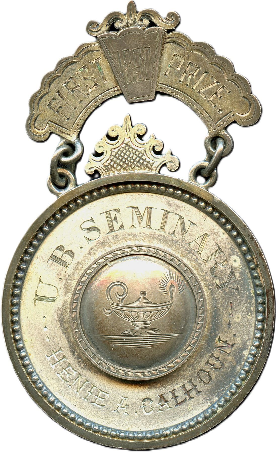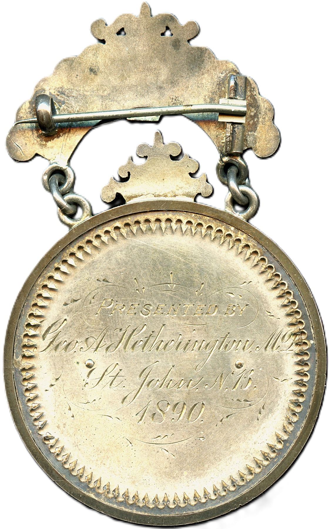 Hanger "First 1890 Prize", 36 x 24mm, Awarded to Henie A. Calhoun, Presented by Geo. A. Hetherington, MD (1851-1911), St. John, N.B. 1890. 41 x 51mm, 26.8g, EF. 1pc. From the Geoffrey Bell Collection.