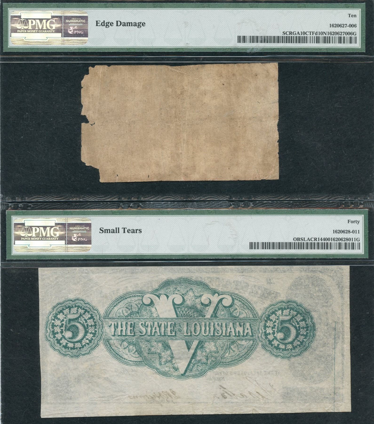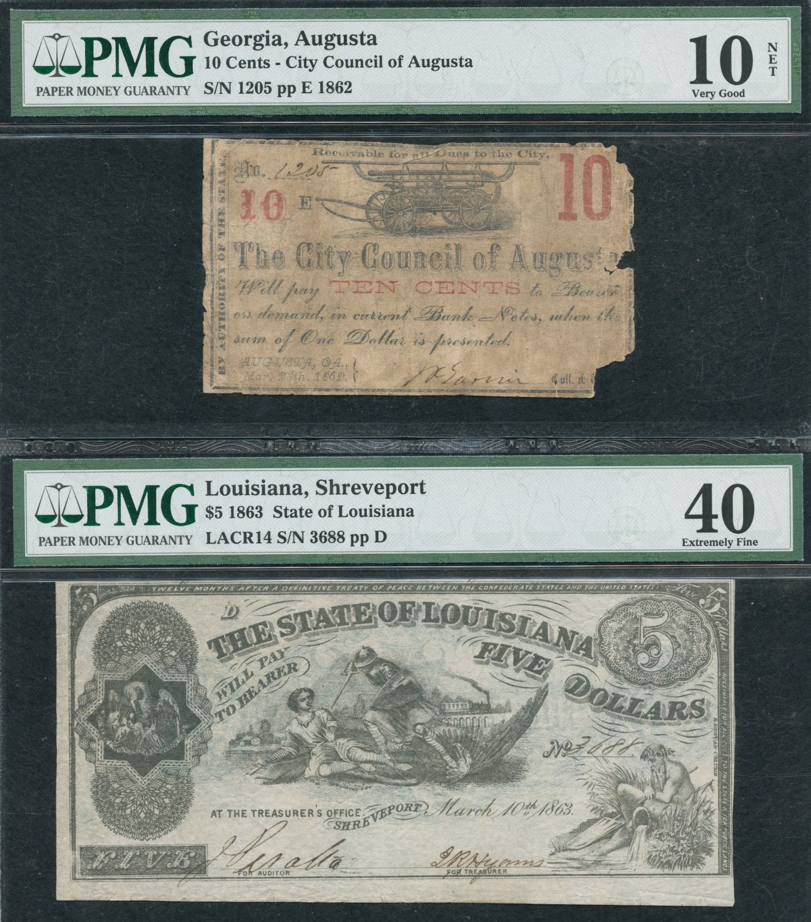 The State of Louisiana, Shreveport. $5, 1863. PMG EF 40. S/N:3688. & City Council of Augusta, 10 cents, 1862. PMG VG 10 net. S/N:1205. 2 pcs.