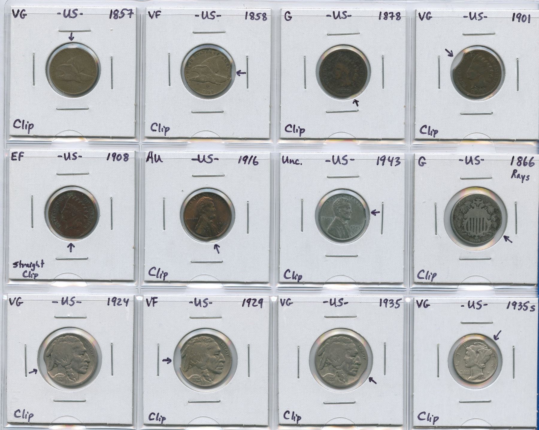 Lot of 12 classic design US coins, all struck on clipped planchets. Lot includes seven 1-cent coins (1857 to 1943) and four 5-cent coins (1866 to 1935) and a single 10c (1935s). Some are low mintage dates and errors are likely scarce. Patrick Glassford Collection.