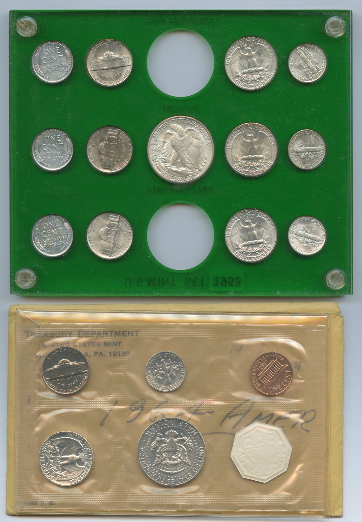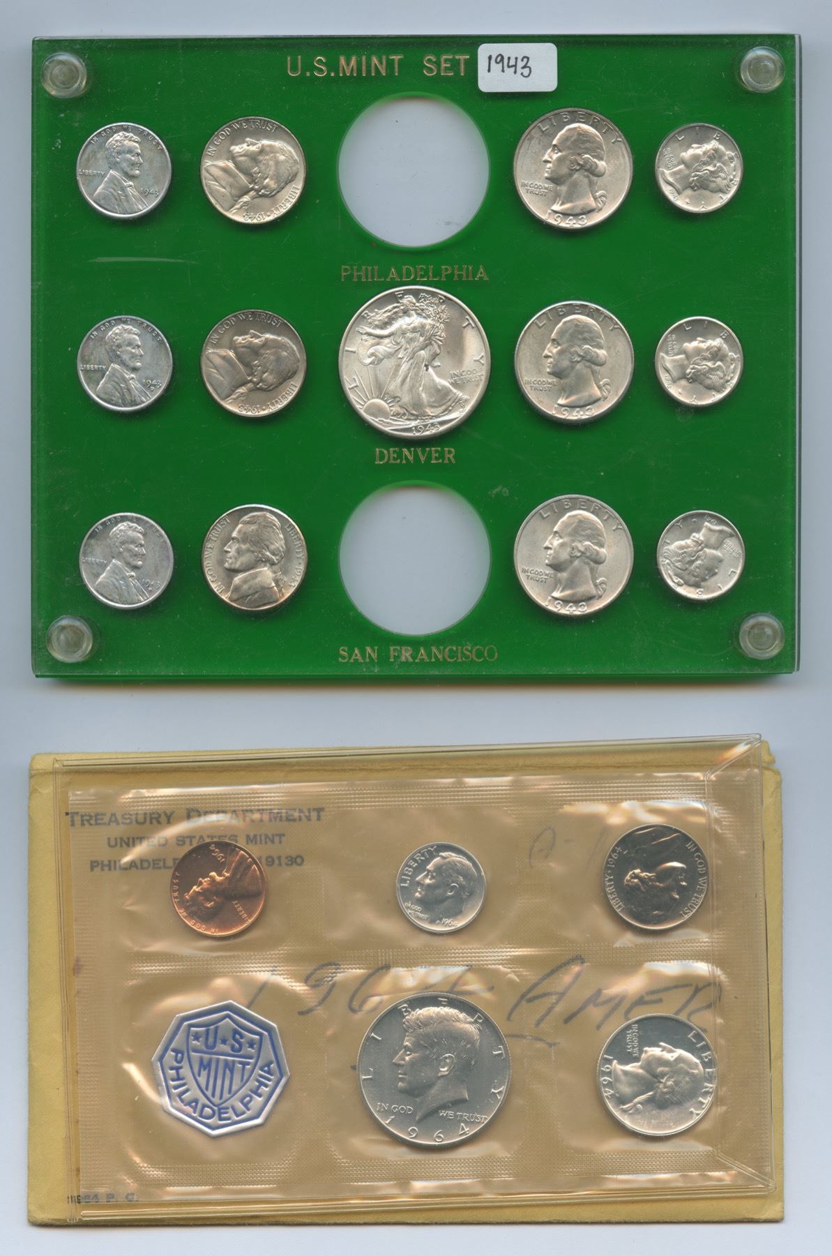 Beautiful 1943 Mint set from Philadelphia (no half), Denver & San Francisco (no half) in uncirculated condition. The steal cents have a stunning rainbow toning. Also included in this lot is the famous 1964 sealed proof set featuring JFK on the half dollar in uncirculated condition.