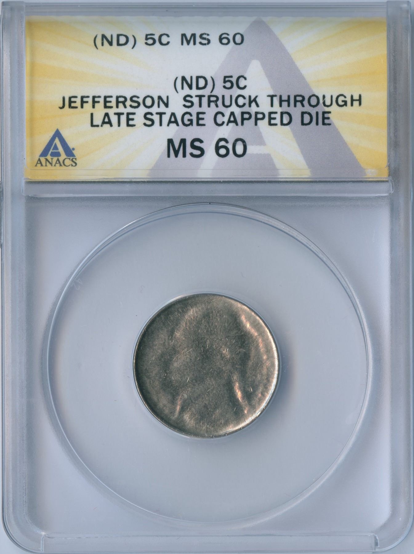 USA 5-cent ERROR - United States 5c (No Date), struck through a late stage capped die, ANACS MS-60.