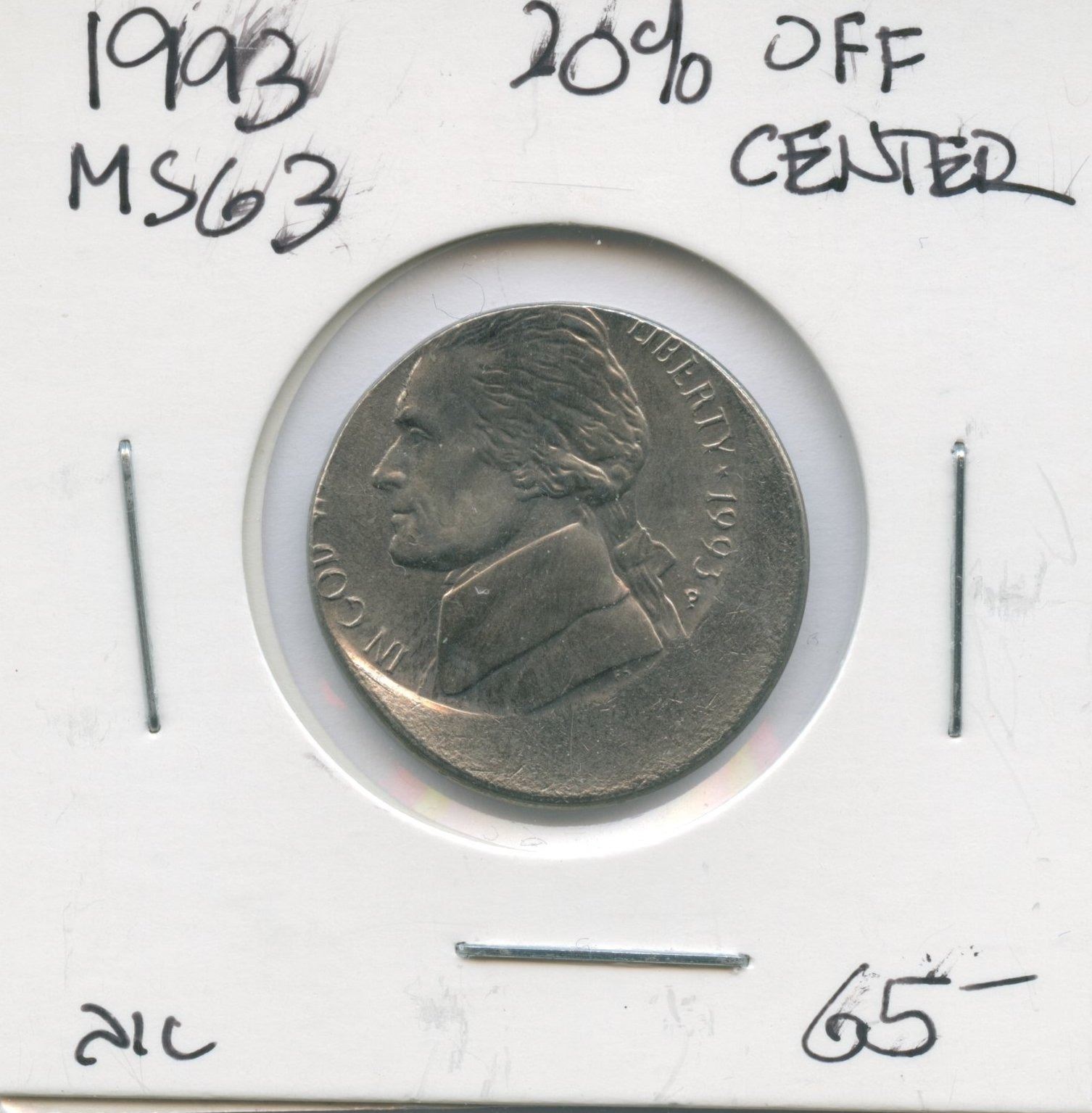 US 1993 5-cent struck struck 20% off-centre, coin is mint state (estimated MS-63 or better).