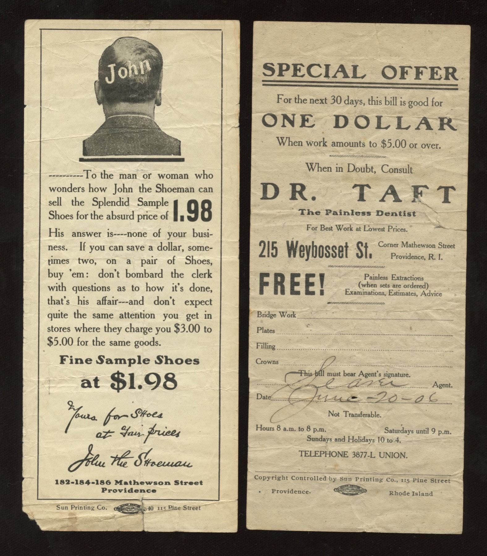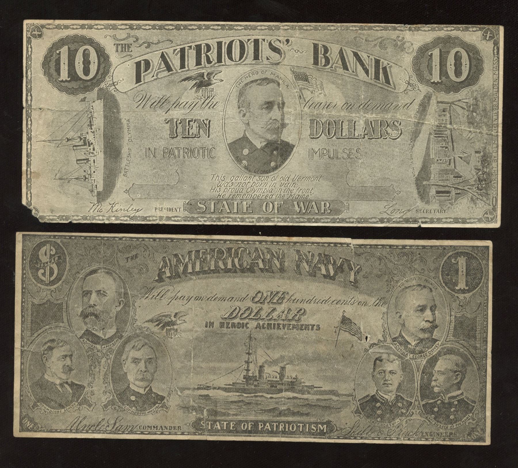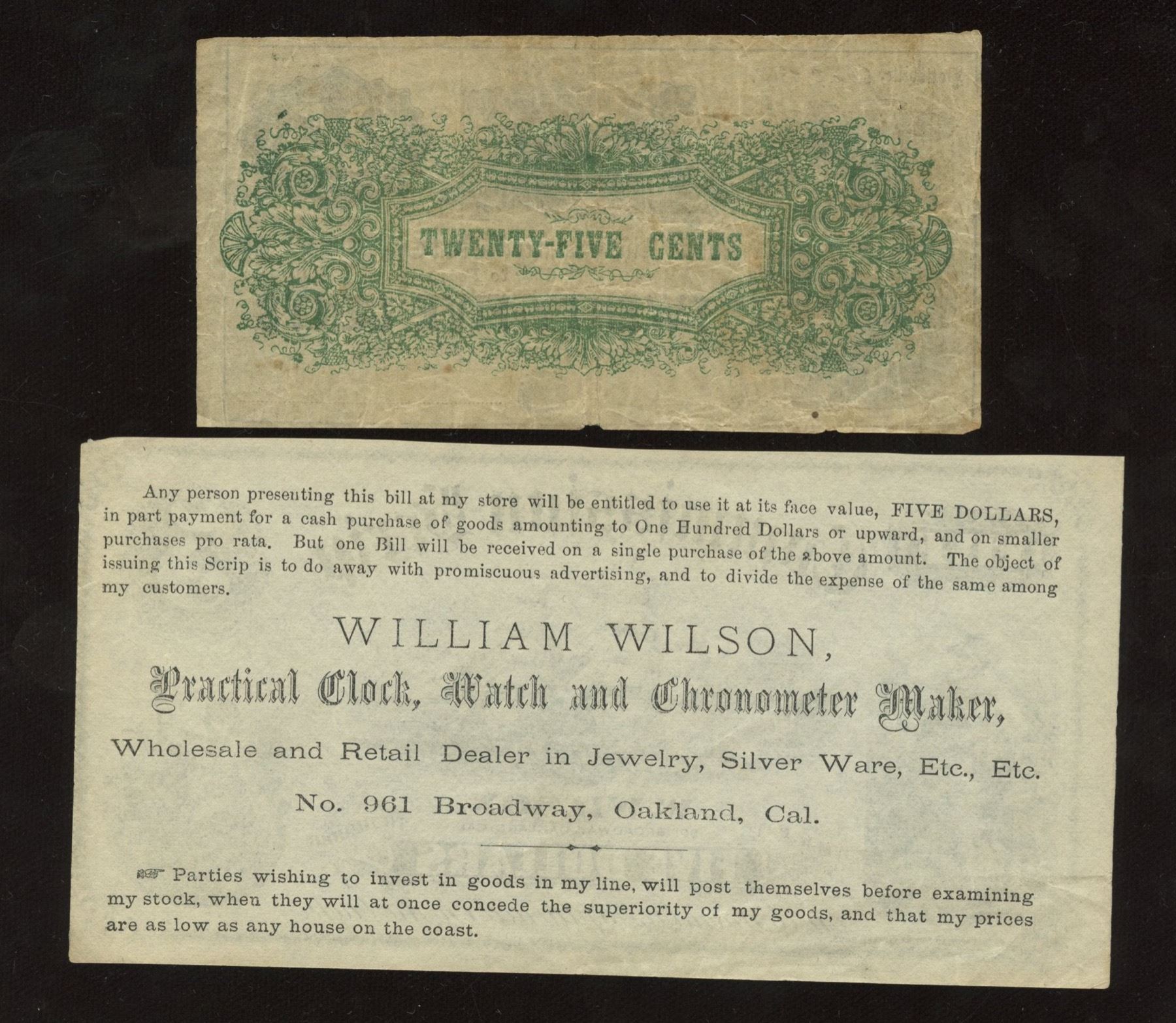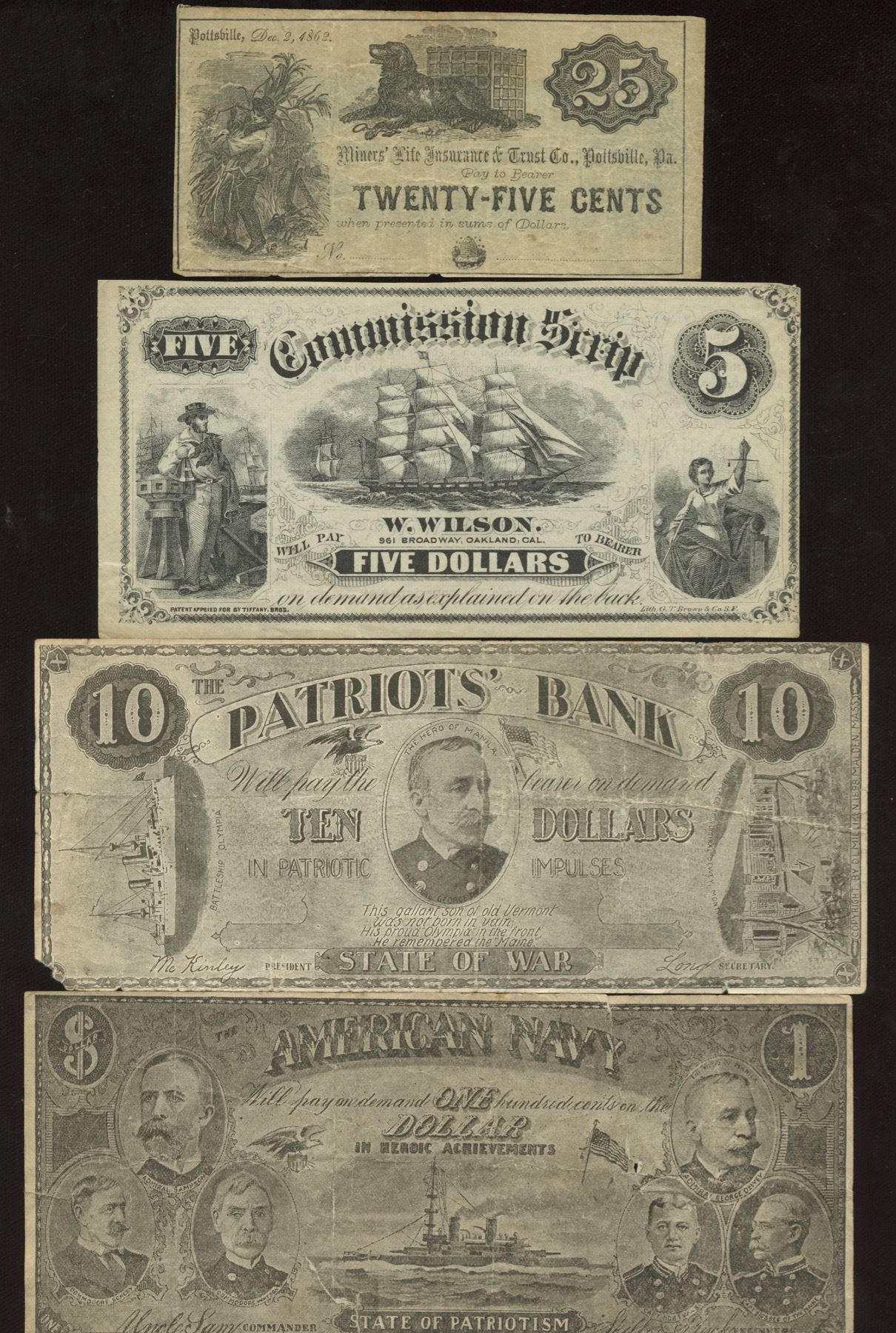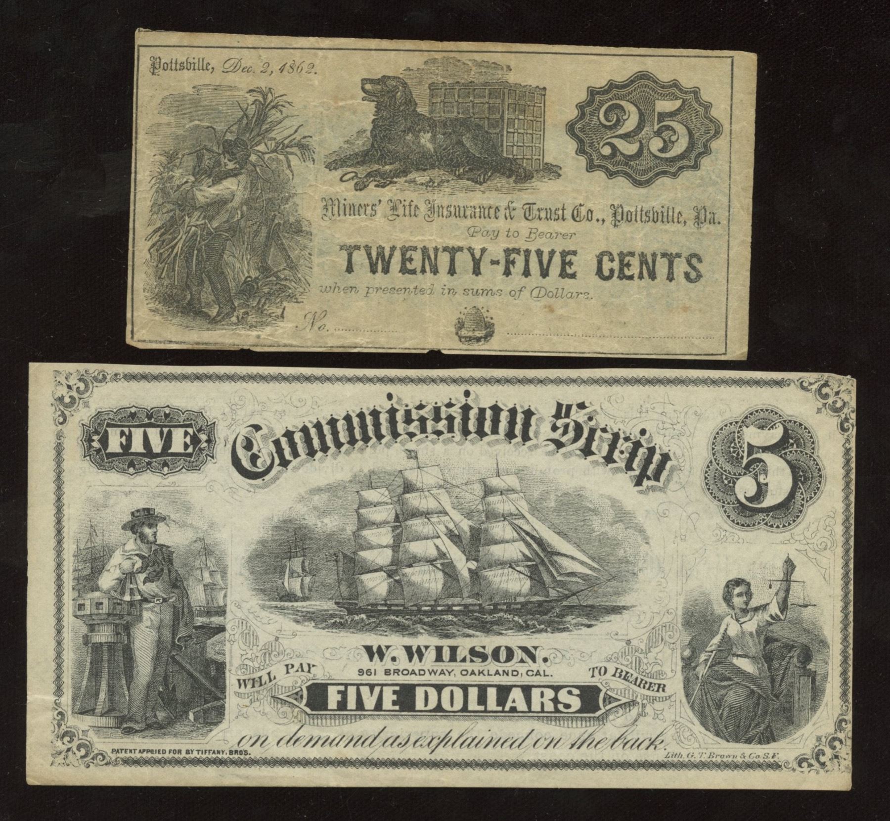 Includes: California, W. Wilson $5, dealer in jewelry & silverware. Patriots Bank $10, John the Shoeman. American Navy $1, Dr. Taft - The Painless Dentist. Miners Life Insurance & Trusts Co. Pottsville, PA. Twenty-Five Cents, remainder. 4 pcs.